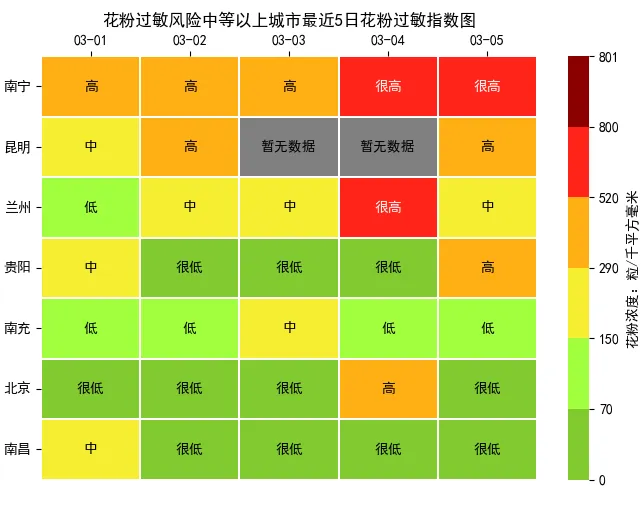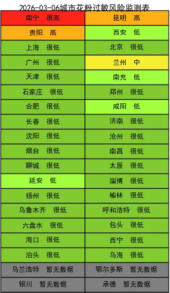 南宁花粉过敏风险很高!昆明、贵阳花粉过敏风险高!共有 7 个城市最近5日曾经花粉浓度过敏风险中等以上,3月6日花粉过敏指数播报