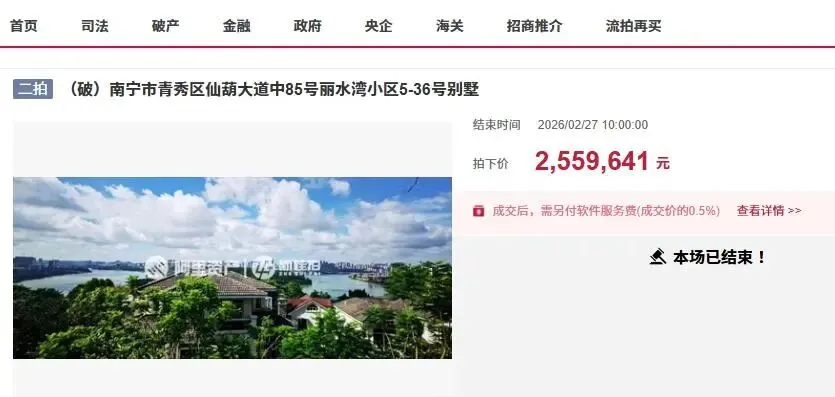 此次拍卖的这栋别墅,属于破产公司资产处置拍卖,别墅为开发商广西合诚房地产开发有限公司所有,广西合诚房地产开发有限公司已经破产了。此次拍卖,起拍价只有255.9641万元,折合单价才5968元/平方米,结果只有一个人报名竞拍,以起拍价就捡漏买下了这栋独栋别墅。