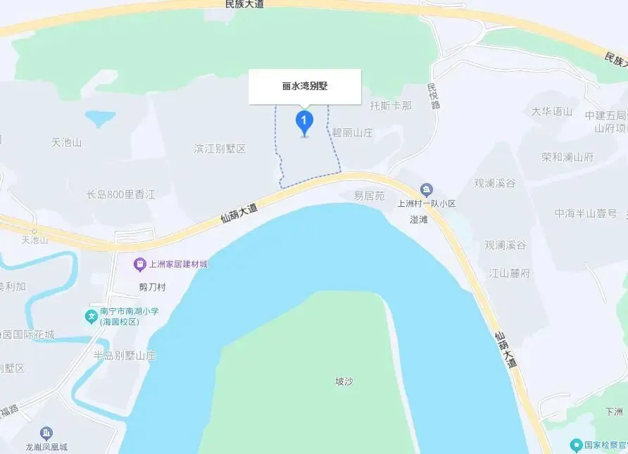 此次拍卖的这栋别墅,在南宁市,位置比较特别,所在小区丽水湾小区,位于南宁市仙葫板块,刚还在邕江一个大拐处,俗称反弓水的位置。这个地方,自然环境不错,有山有水,但很多人却说风水不好。另外,这里相对来说,在南宁市还是比较偏僻的位置,虽然这里建有很多别墅小区,但是缺乏人气,相关商业等配套不够完善,地铁都没有通。
