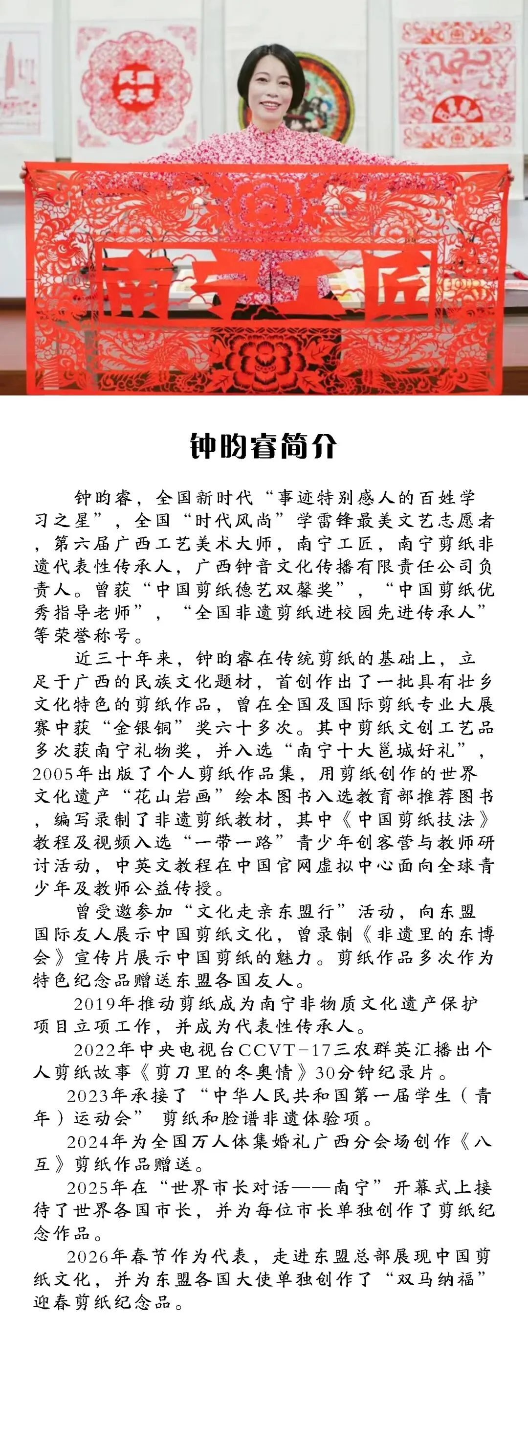 3月4日,全国新时代事迹特别感人的百姓学习之星、全国时代风尚学雷锋最美文艺志愿者、广西工艺美术大师、南宁工匠、南宁剪纸代表性传承人钟昀睿,走进南宁市吉祥路幼儿园,开展非遗剪纸文创体验活动,与师生们一同以纸为媒、以剪为笔,亲手制作一盏盏满载祝福的非遗剪纸夜灯,让传统技艺在指尖绽放光彩,用非遗文化点亮心灵之灯。
