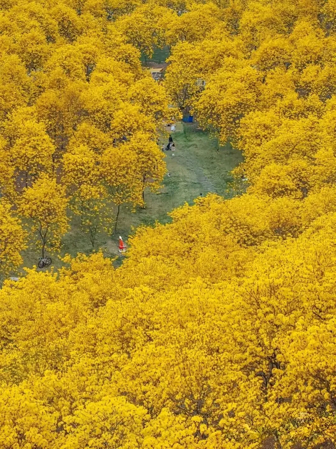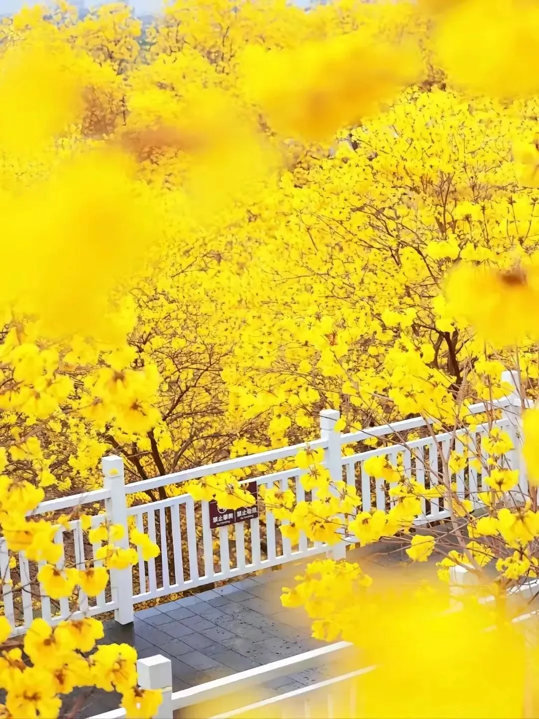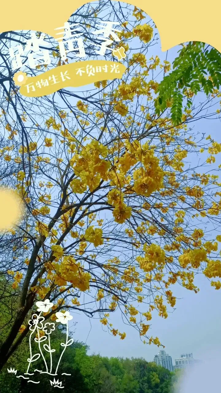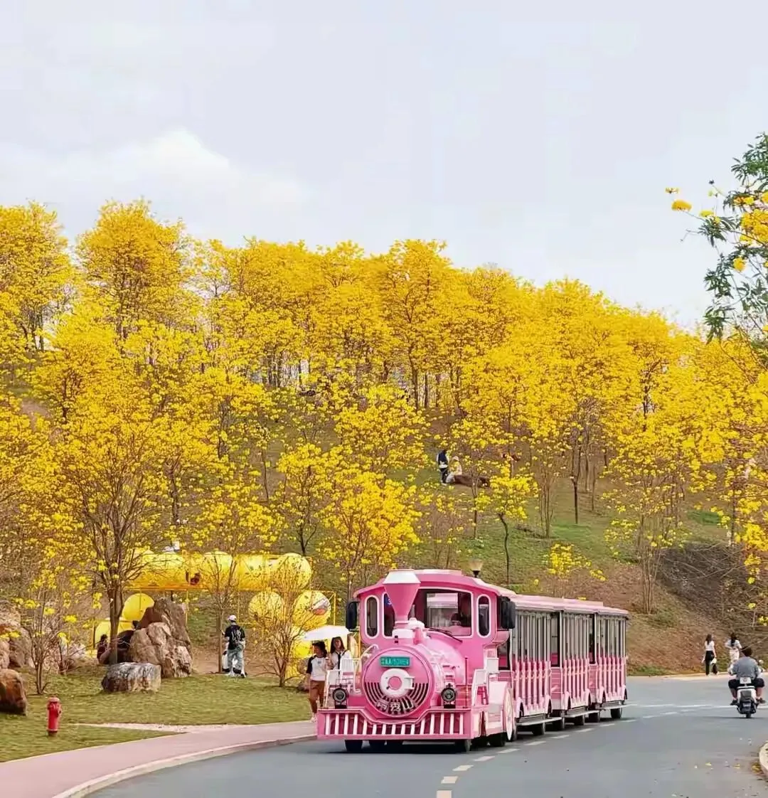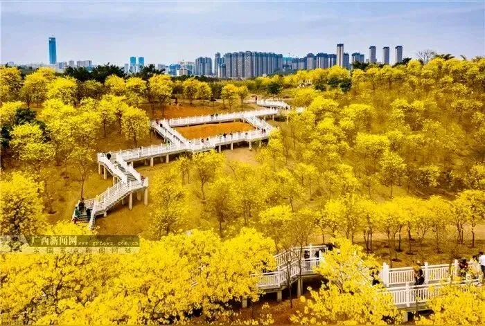 南宁青秀山的黄花风铃终于开了,又到赏花的季节,风铃谷已被一片磅礴的金黄点燃。近七千株黄花风铃木,四百亩连绵花浪,在二月末的风里,先花后叶,把枝头缀成一串串饱满的金铃 。