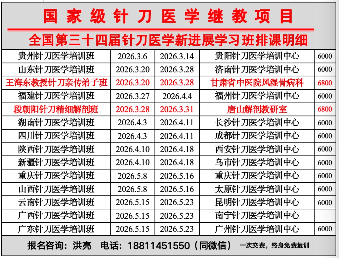为响应国家中医药管理局关于推广及普及中医专业实用技能的通知,为了规范针刀医学临床诊疗技术,普及推广针刀医学治疗实用技能,同时交流各地针刀医学临床诊疗先进经验。世界针刀医学研究会学术部主办,北京萃博针刀医学研究院承办“全国第三十四届针刀医学新进展培训班” (针刀临床技能进展系列培训班,项目编号Z20261521030),将定于2026年5月15日—5月23日在广西省南宁市举办,届时将邀请全国知名针刀医学专家授课,欢迎贵单位组织相关人员参加。【承办单位】北京萃博针刀医学研究院,北京萃博王九针刀医学科技有限公司 【培训对象】凡从事骨科、风湿科、疼痛科、针灸推拿科、针刀、软伤科、麻醉科、康复理疗科、内科等各级医院、门诊、诊所的临床医生均可报名参加。1.学员结业后由学会 颁发结业证,并授予国家Ⅰ类中医学继续教育学分证书(60学时,计10学分)2.办理证书:请带1寸彩照2张,身份证复印件及职称证、学历证、执业医师证复印件(办理结业证、学分证及上网认证用)。【培训时间】2026年5月16日—5月23日 (5月15日报到)【相关费用】6000元 一次交费终身免费复训 (包括培训注册费、培训费、资料费、临床见习、手术观摩等费用。培训期间食宿由会务组统一安排(也可自行安排)费用需自理注:需要正式Word版针刀学习红头文件的学员请添加我微信索要【报名办法】请及时填写报名回执表并传真或发电子邮件至组委会,我们将根据回执情况提前半月向您寄发培训报到须知,告知详细的培训日程安排及其他具体事宜。