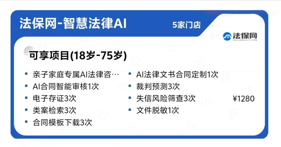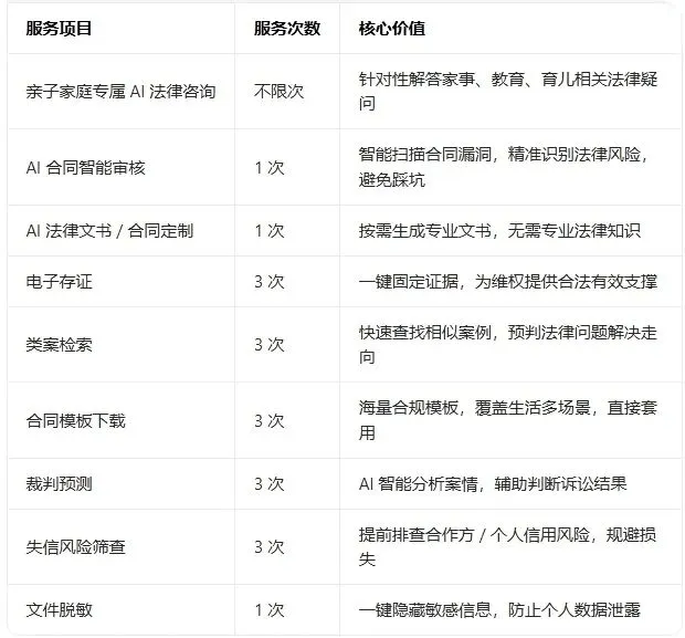 2.全家法律硬保障:直接解锁Lawone智慧法律AI服务包(价值1280元),打开小程序即可使用全部权益,为家庭财富、子女权益、家事纠纷保驾护航