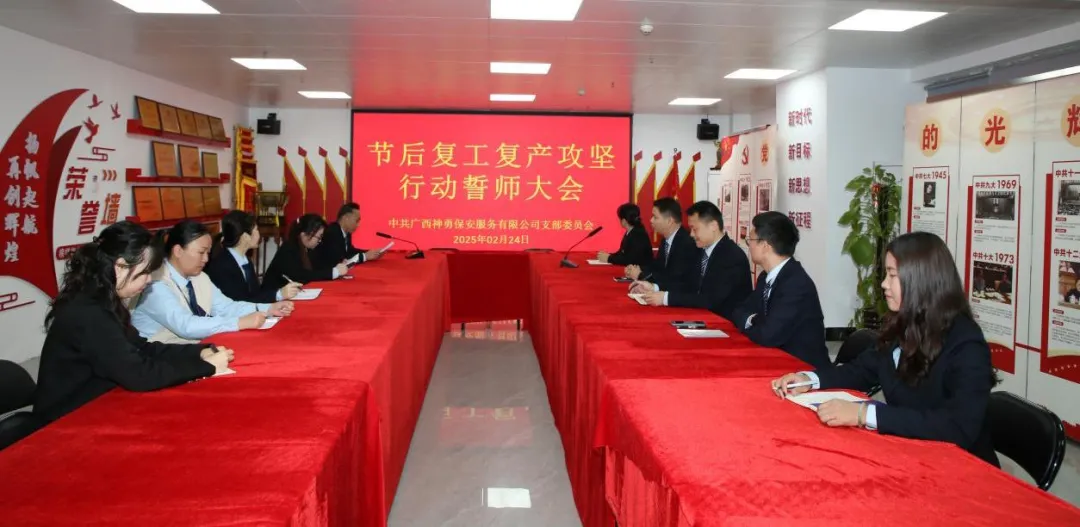 广西神勇保安服务有限公司党支部率先组织思想作风、安全规范学习,全体党员重温入党誓词,立足安保岗位谈担当、话落实,进一步强化宗旨意识和责任观念。