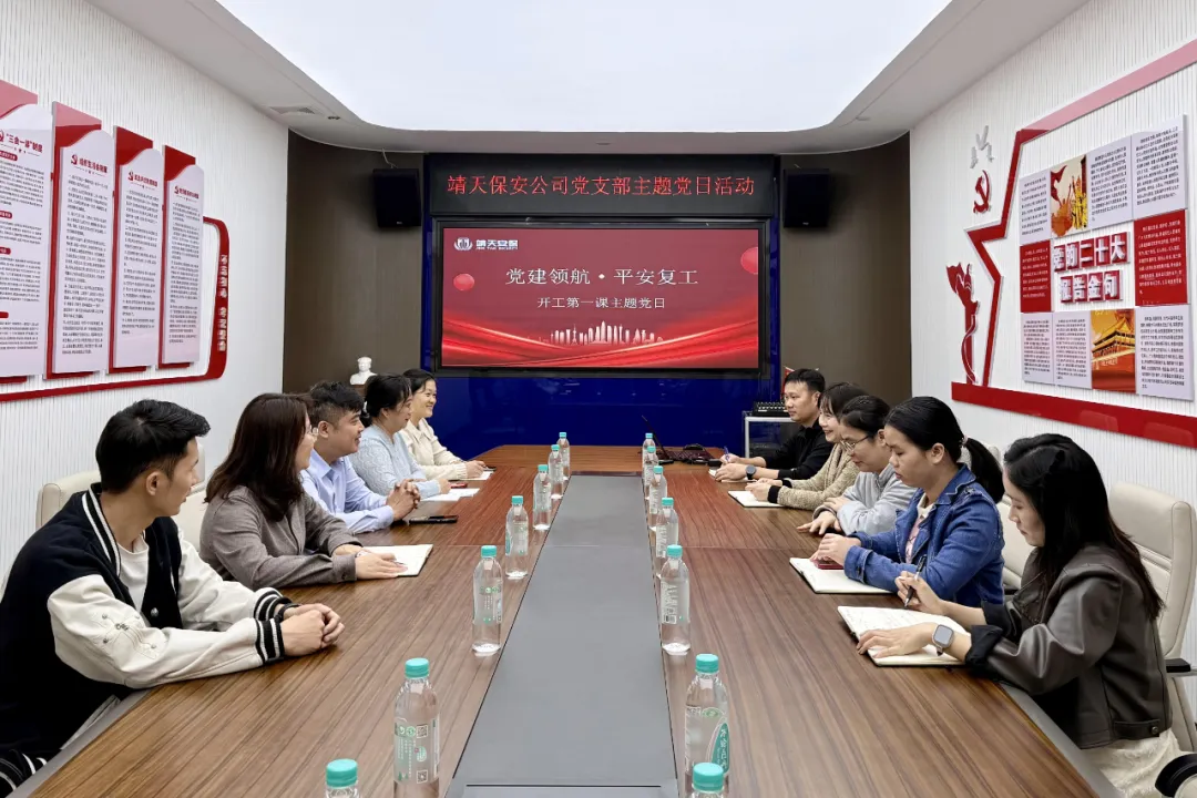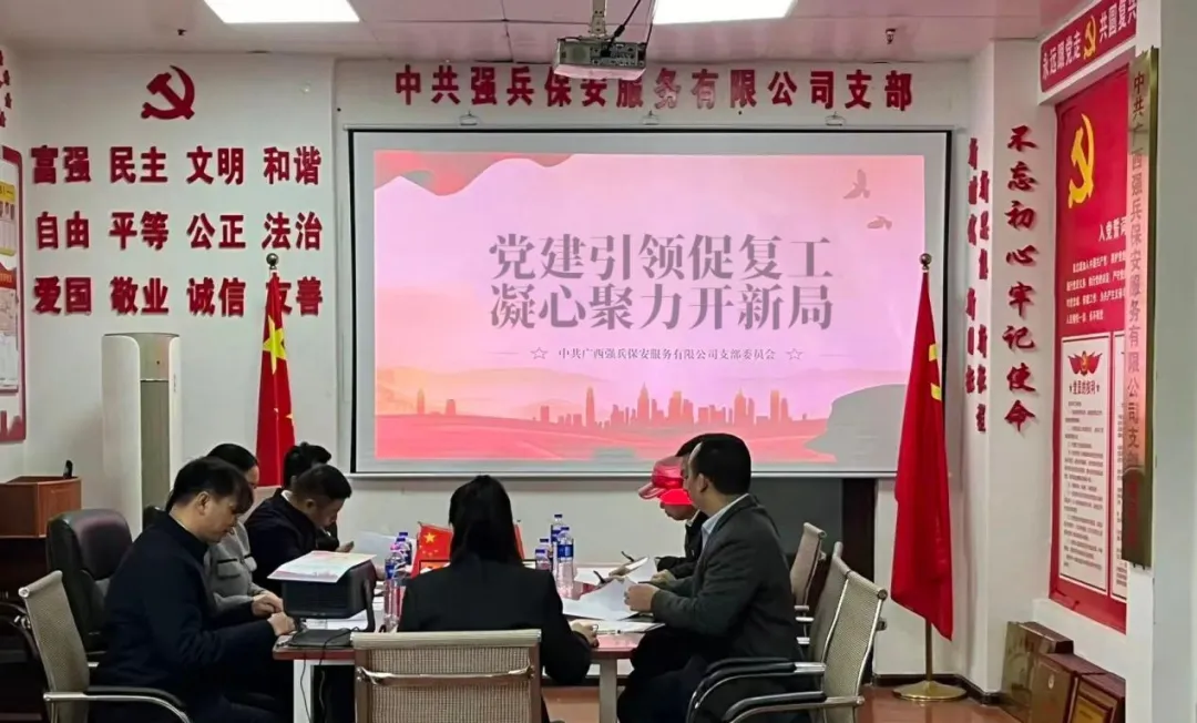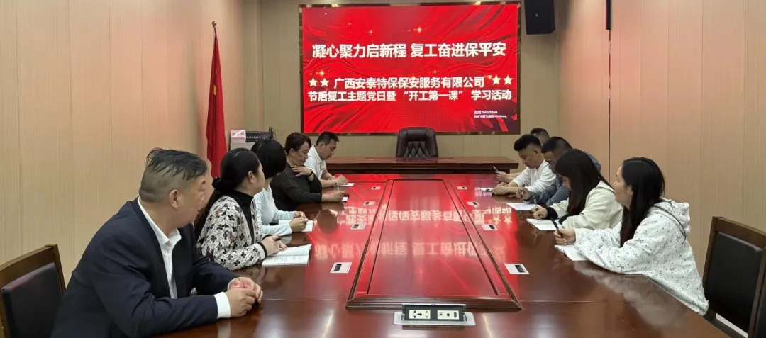 广西靖天保安服务有限责任公司党支部开展“党建领航・平安复工”主题党日,以安全生产为核心,党员带队开展重点部位全覆盖安全排查;神之盾保安集团有限公司广西分公司党支部以开工第一课赋能思想,推动党员职工快速从假期模式切换至工作状态;广西强兵保安服务有限公司党支部召开复工专题部署会议,明确全年安保服务重点工作;广西国之泰保安服务有限公司党支部将开工第一课纳入复工整体部署,同步做好政策解读与任务落实;广西安泰特保保安服务有限公司党支部把开工第一课与主题党日结合,聚焦安全生产、规范执勤开展学习;广西百全保安服务有限公司党支部在开工第一课中剖析安全案例,牢固树立全员安全责任理念;陕西京泰源保安服务有限公司广西分公司党支部开展开工第一课,重温党的二十大精神,强调复工后岗位职责与服务标准。