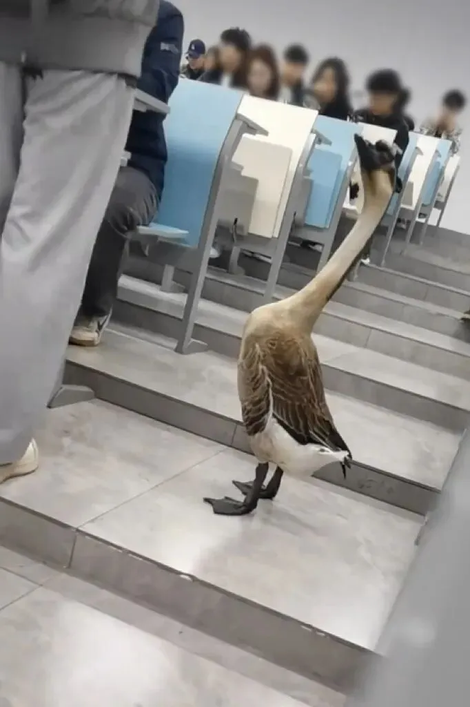 画面显示,一只大鹅在阶梯教室里旁若无人地踱步,不时发出“嘎嘎”的叫声,而旁边的学生们早已见怪不怪。