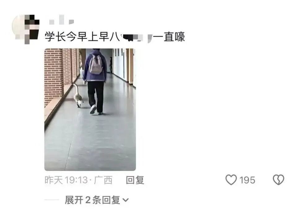 3月3日,广西南宁一学生发视频称鹅学长又到教室里来了。