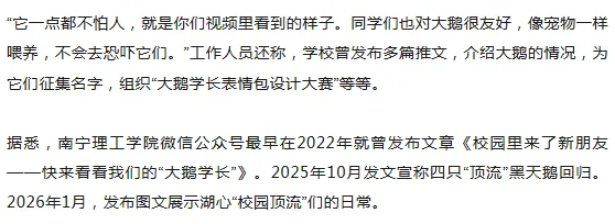 3月4日,潇湘晨报·晨视频记者致电南宁理工学院校办公室,工作人员表示,视频里的“网红”鹅确实是学校养的,除此之外还养了很多只,平时都在景观湖边。记者在网上看到的这只鹅与同学们互动最密切,也经常在校园里大摇大摆地走。