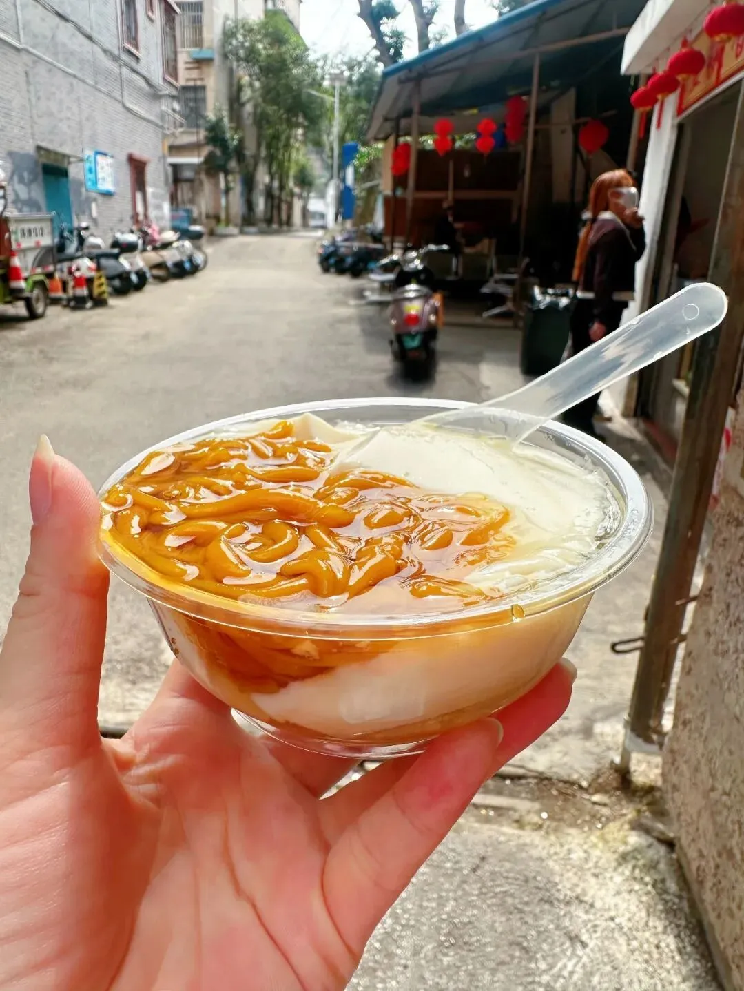 在南宁,想找一碗又便宜又好吃的糖水,真的不用去网红店挤破头。只要你愿意往蒲庙老街里钻,就能发现像“豆飘香”这样的宝藏小店。3块钱一碗的槐花粉豆腐花双拼,让我在这个物价飞涨的年代,找回了小时候夏天的味道。 我是偶然间朋友推荐才知道这家店的。跟着导航拐进蒲津路,穿过几条充满生活气息的小巷,远远就看到了“豆飘香甜品店”的招牌。红底黄字的招牌上挂着几个红灯笼,门口摆着一个小小的冰柜,里面塞满了各种饮料,几个阿婆阿姐正围着柜台排队,一看就是附近街坊常来的地方。 店面不大,甚至可以说有点简陋。没有精致的装修,也没有花里胡哨的菜单,只有一块蓝色的价目表贴在墙上。上面清晰写着:槐花粉3元,豆腐花3元,双拼3元,芝麻花生糊4元。看到这个价格,我真的有点不敢相信自己的眼睛。在南宁市区,随便一杯奶茶都要十几块,而在这里,3块钱就能吃到两种地道的广西甜品。 我毫不犹豫地要了一碗槐花粉豆腐花双拼。负责打糖水的是一位和蔼的阿姨。她手脚麻利地掀开一个大不锈钢桶的盖子,用勺子舀起一勺白嫩的豆腐花,再从旁边的透明塑料盒里舀出一大勺金黄的槐花粉,最后浇上一勺晶莹剔透的冰糖水。整个过程行云流水,不到半分钟,一碗甜品就递到了我手里了。 我捧着这碗甜品,找了个街边的角落站着吃。先舀一勺豆腐花,入口的瞬间我就被惊艳到了。它真的太嫩了,轻轻一抿就在嘴里化开,没有一点豆腥味,只有淡淡的豆香和清甜。紧接着,我又尝了一口槐花粉。这是广西特有的小吃,用槐花汁和米浆做成,一条条胖糯糯的,颜色是诱人的琥珀色。它滑溜溜的,带着一股独特的植物清香,和豆腐花的软嫩形成了奇妙的口感对比。 两种食材在嘴里碰撞,豆腐花的绵密和槐花粉的爽滑,再加上红糖水的清甜,一口下去,所有的燥热和疲惫都烟消云散了。我一边吃,一边看着街上来来往往的行人。这种感觉,就像是把自己从快节奏的都市生活里抽离出来,融入到了这个小镇的慢时光里。 据说这家店已经开了几十年了,是附近几代人的童年记忆。店里的甜品都是阿姨们每天凌晨起来手工制作的,没有任何添加剂,用的都是最朴素的食材。槐花粉的颜色比别处更深,是因为用了新鲜的槐花;豆腐花的口感更嫩,是因为用了自家磨的黄豆。 3块钱,在今天能买到什么?可能只是一瓶矿泉水,或者一根冰棍。但在蒲庙的这家小店里,3块钱买到的,是一份货真价实的美味,是一段无忧无虑的童年回忆,更是一种被时光温柔以待的治愈感。 如果你也厌倦了城市里千篇一律的网红甜品,不妨来蒲庙老街走一走。在“豆飘香”这样的小店里,花上几块钱,就能品尝到最地道的广西味道,感受最纯粹的人间烟火气。