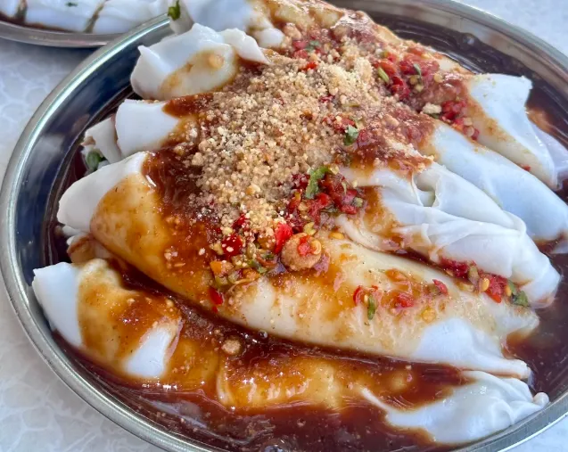 米浆摊得极薄,蒸气一熏就透亮。裹上碎肉木耳,刷一层香油,撒上炸葱头。这东西不是吃饱的,是吃那个“滑”劲儿。蘸料是灵魂,酸柠汁加小米辣,一口下去,酸爽直接钻进鼻腔,又不至于呛人,刚刚好。