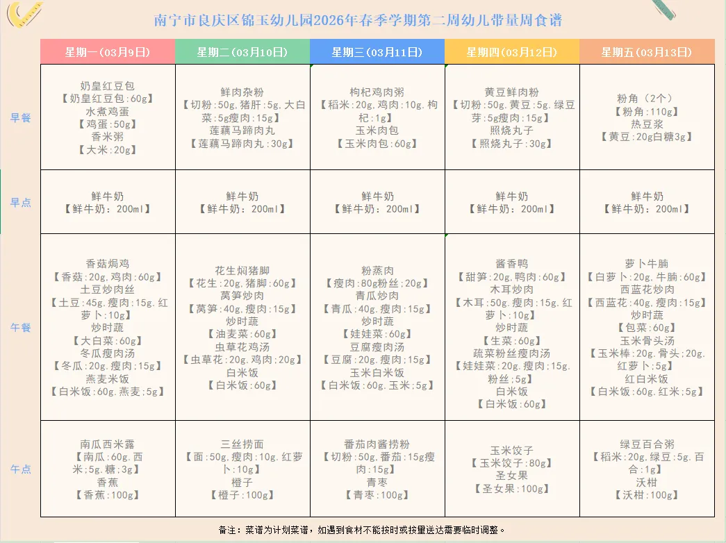 2026年春季学期南宁市良庆区锦玉幼儿园第二周带量食谱