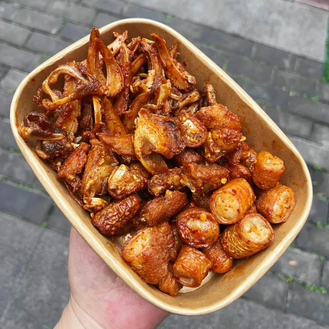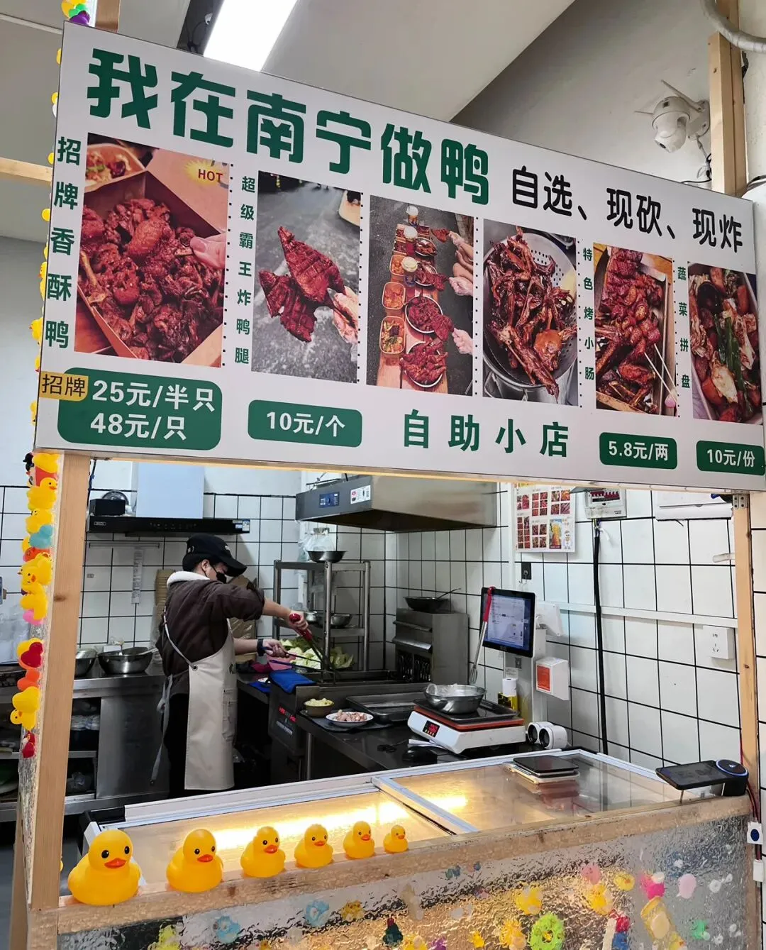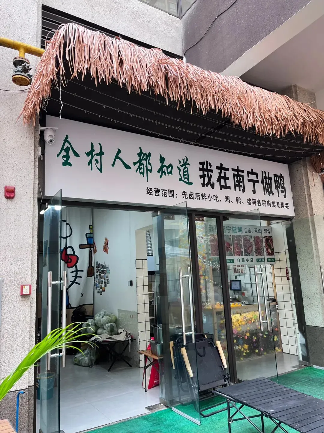 之前看到别人发的炸小肠,看着很好吃的样子,当看到“全村人都知道我在南宁做鸭”这个店名,觉得这个老板应该是一个挺有趣的人,处于好奇,跑去这家店里,看看他们做的东西好不好吃。去到店里,主要是奔着炸小肠去的,看到其他想吃的,就顺便都拿了一些。刚炸出来,吃了一口,太好吃了,好久没有吃到那么好吃的炸物了。特别是那个小肠,太好吃了,有点后悔小肠拿少了。问店员是什么小肠,她说她也不知道🤷。这家店是做鸭子的,可能是鸭肠吧?但是鸭肠好像没有那么大,是什么这些都不是很重要,作为“吃货”,好吃才是主要的。因为点了其他软骨还有鸡脚筋,它们是和小肠放在一起炸的,端出来的时候,混杂在一起,小肠都没见到几块。软骨点得太多,失策了。虽然软骨和鸡脚筋也很好吃,但是骨头占比太大,嚼得腮帮子好累。终于知道为什么那么多人点小肠了,小肠嚼起来香香润润的,嚼得不累又不塞牙。还点了一份蔬菜拼盘,蔬菜拼盘里有包菜、土豆、香菇、豆角等,本来还以为素菜估计就一般,没抱着什么期待,结果是出乎意料的好吃,吃到差点咬到舌头,已经想不出形容词了。炸物刚出锅的时候是最好吃的,外卖运送的过程中热气遇冷成水滴,容易反水,影响口感,特别是肉类的,有条件的话能在店里吃,味道更好。蔬菜拼盘原本以为炸过,吃起来会“干巴巴”的,结果没有,即便凉了也还好吃,毕竟蔬菜的水份被锁在里面,外头反水,对它们的影响不算很大。这炸土豆吃起来香香糯糯的,点的这些东西里,我个人觉得最好吃的是小肠,然后就到它了。他们家的炸物是自选称重的,5.8块钱一两,鸭腿是按个算的,10块钱一个,据说他们家的炸鸡尖也很好吃,可惜当时鸡尖被压到下边,没仔细看,没发现。他们家还真的是在做鸭,我还以为都是各种炸物,店名就是个噱头,招牌就是香酥鸭,半只是25块钱,一只是48块钱,炸鸭腿看着也好诱人,可惜那天是吃了午饭才去的,这些都没得试,不知道好不好吃,下次有机会再去试一试。他们店放的这些小鸭子童趣十足,可惜不适合给太小的小孩子吃这些。