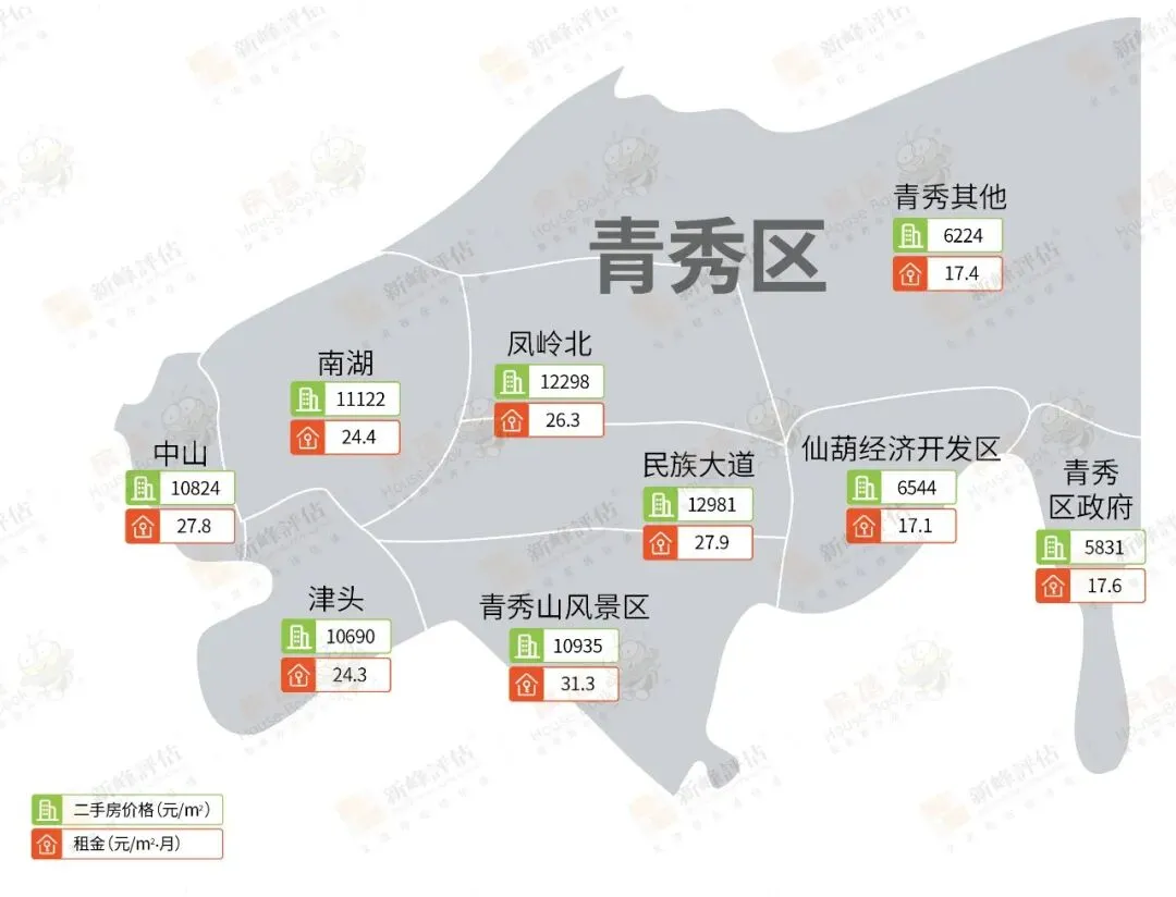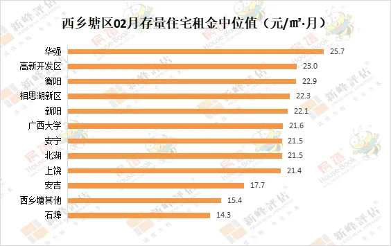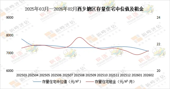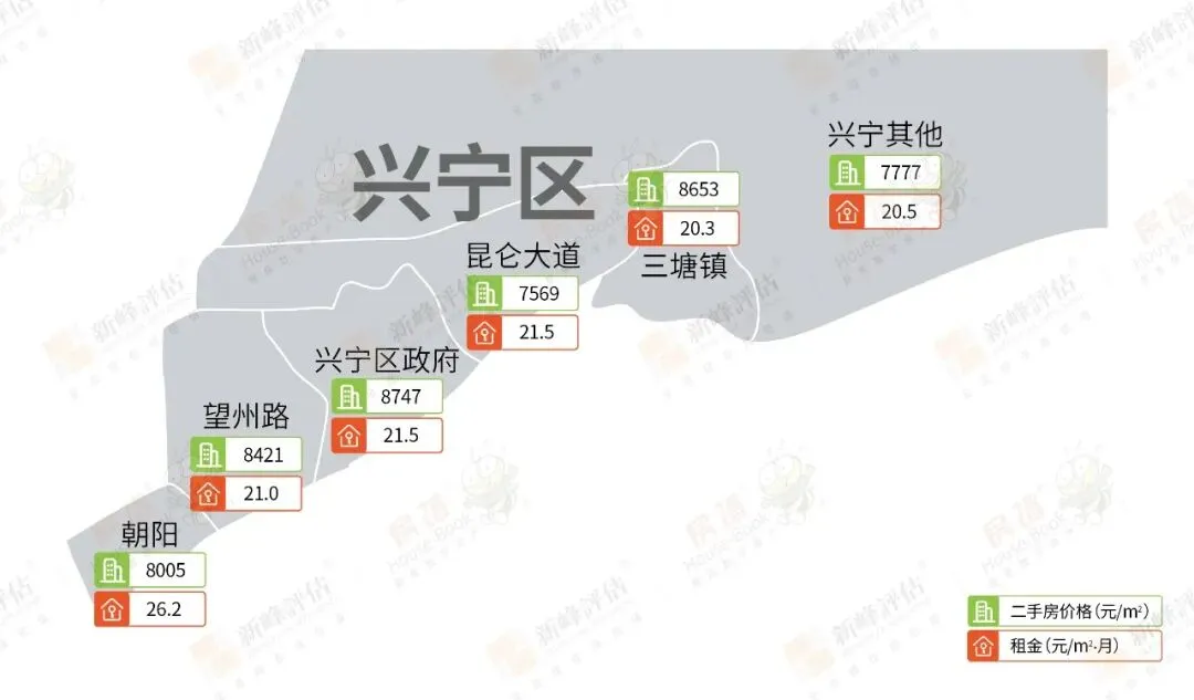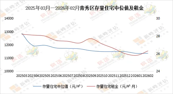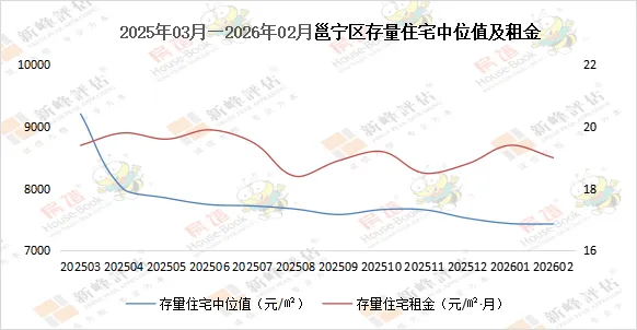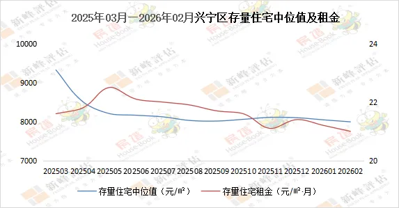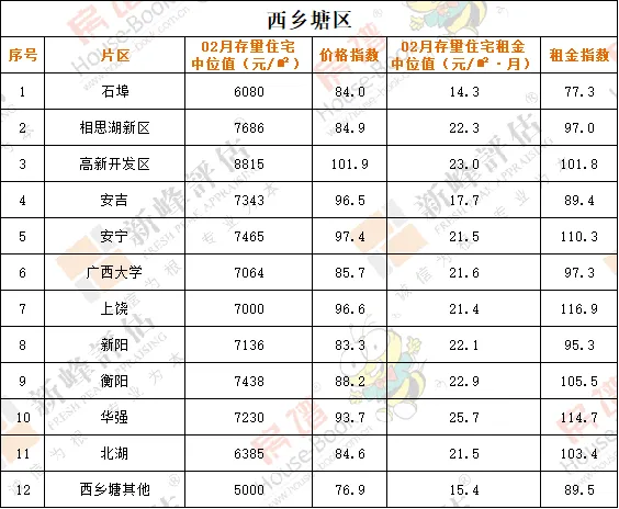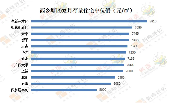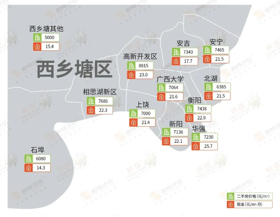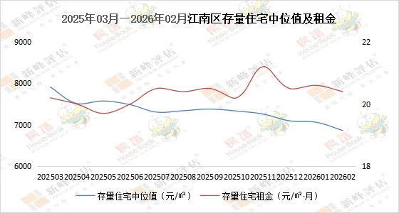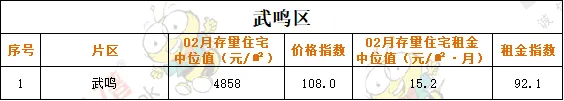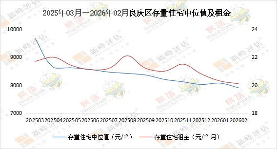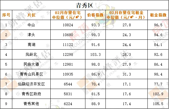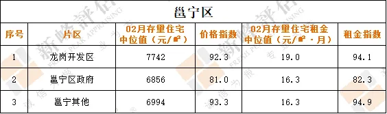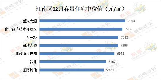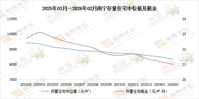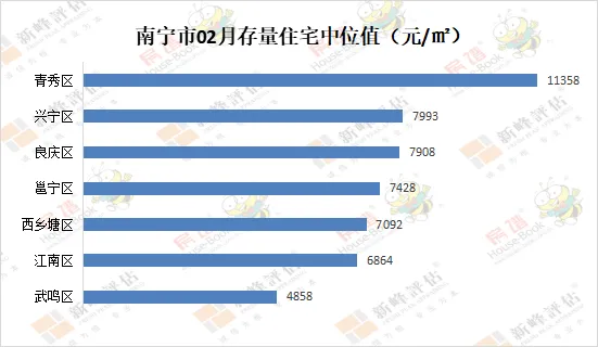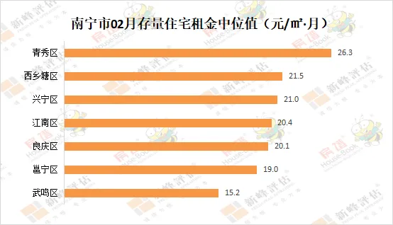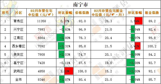 2026年02月南宁市存量住宅中位值8346元/㎡,环比下降1.87%;存量住宅租金中位值21元/㎡·月,环比下降0.94%。02月青秀区存量住宅中位值为11358元/㎡,环比上升0.07%。存量住宅租金中位值为26.3元/㎡·月,环比上升1.94%。02月良庆区存量住宅中位值为7908元/㎡,环比下降2.08%。存量住宅租金中位值为20.1元/㎡·月,环比下降0.99%。02月江南区存量住宅中位值为6864元/㎡,环比下降2.8%。存量住宅租金中位值为20.4元/㎡·月,环比下降0.97%。02月兴宁区存量住宅中位值为7993元/㎡,环比下降0.63%。存量住宅租金中位值为21元/㎡·月,环比下降0.94%。02月西乡塘区存量住宅中位值为7092元/㎡,环比下降2.31%。存量住宅租金中位值为21.5元/㎡·月,环比上升1.42%。02月邕宁区存量住宅中位值为7428元/㎡,环比下降0.11%。存量住宅租金中位值为19元/㎡·月,环比下降2.06%。02月武鸣区存量住宅中位值为4858/㎡,环比上升3.1%。存量住宅租金中位值为15.2元/㎡·月,环比下降2%。说明:本文指数以2018年3月为基期价格测算,基期价格为100。