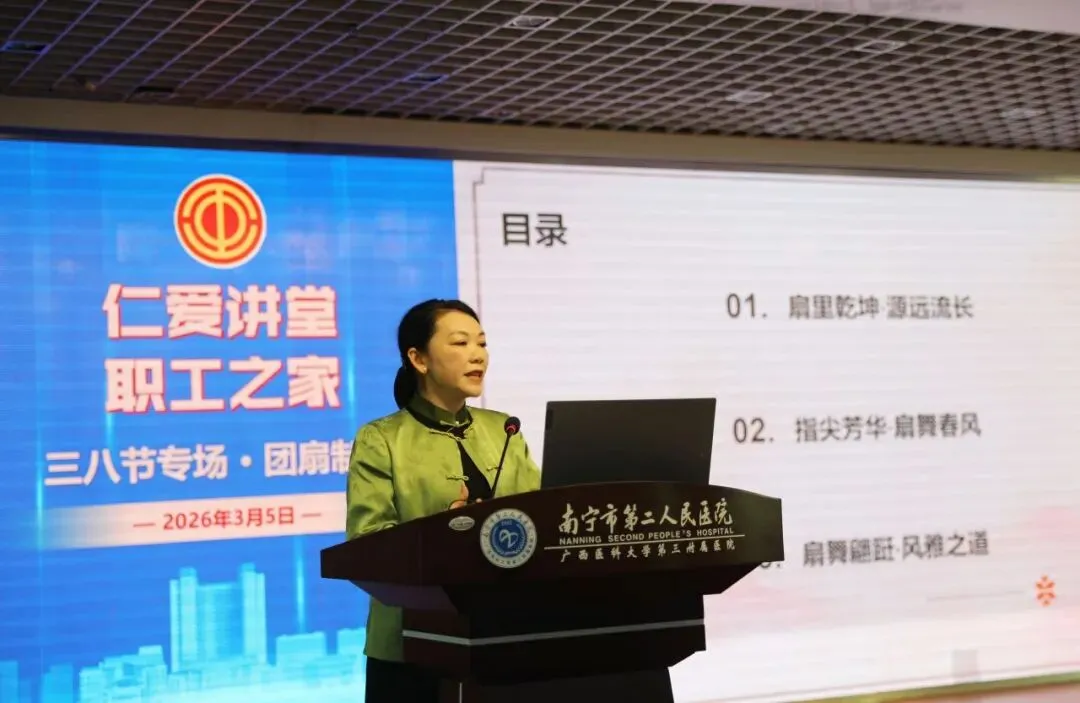 为庆祝第116个“三八”国际妇女节,丰富职工业余文化生活,缓解工作压力,3月5日下午,南宁市第二人民医院工会在综合楼7楼会议室举办了以“指尖传情,扇韵芳华”为主题的“仁爱讲堂”三八节专场团扇手工制作活动。来自医院各科室的两百名在职女职工欢聚一堂,在手工创作中感受传统工艺的魅力,共度温馨节日。