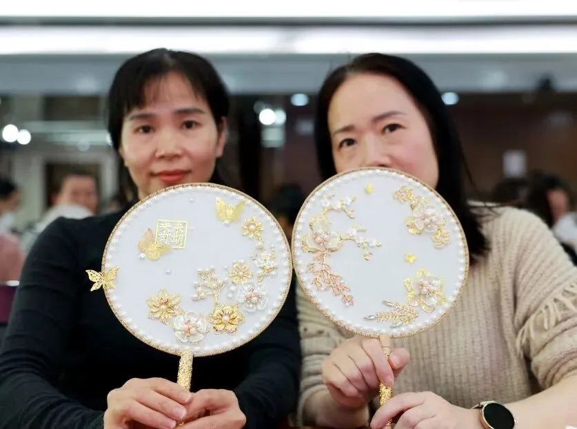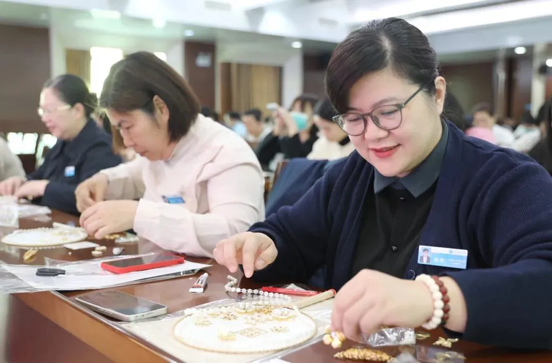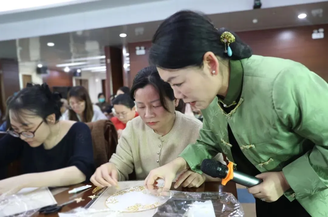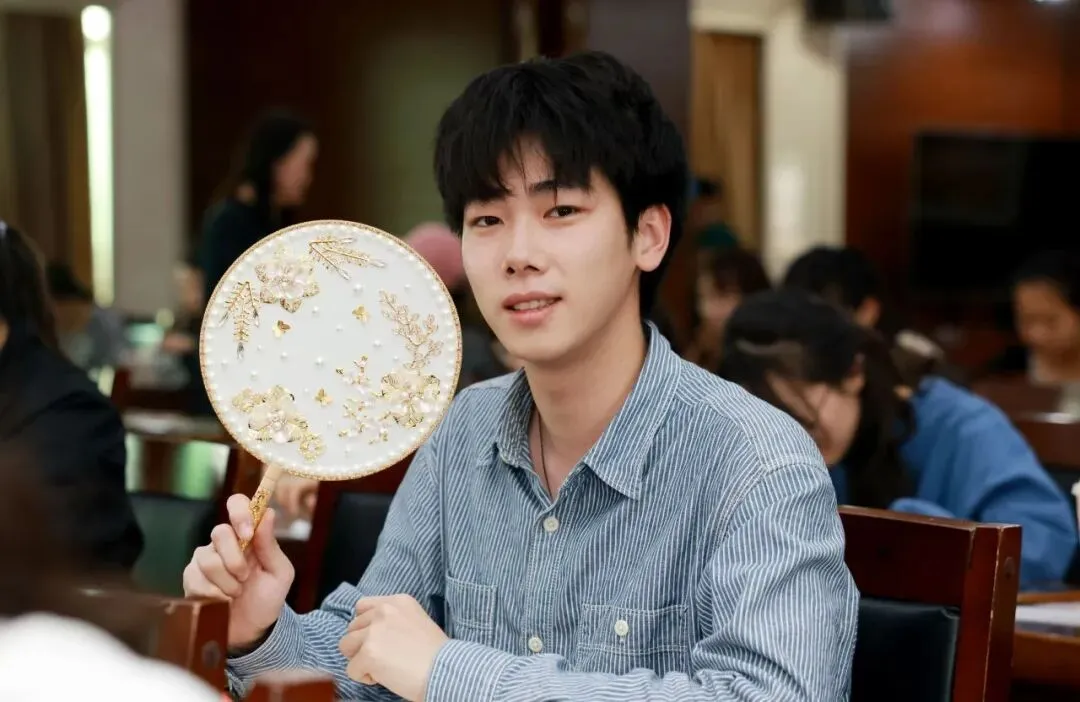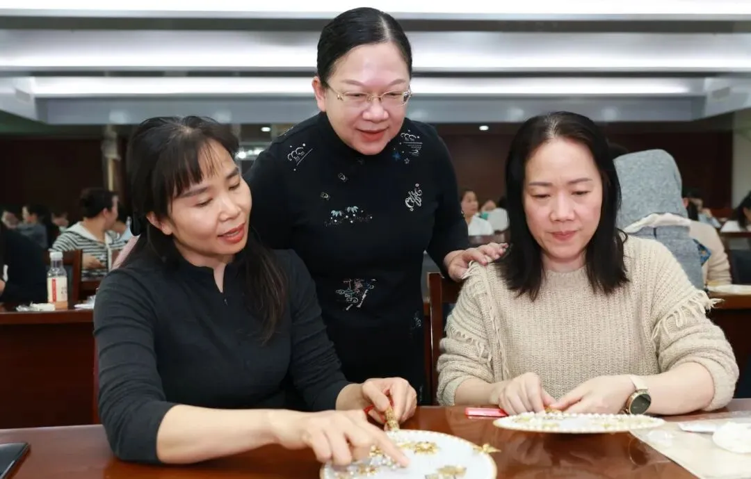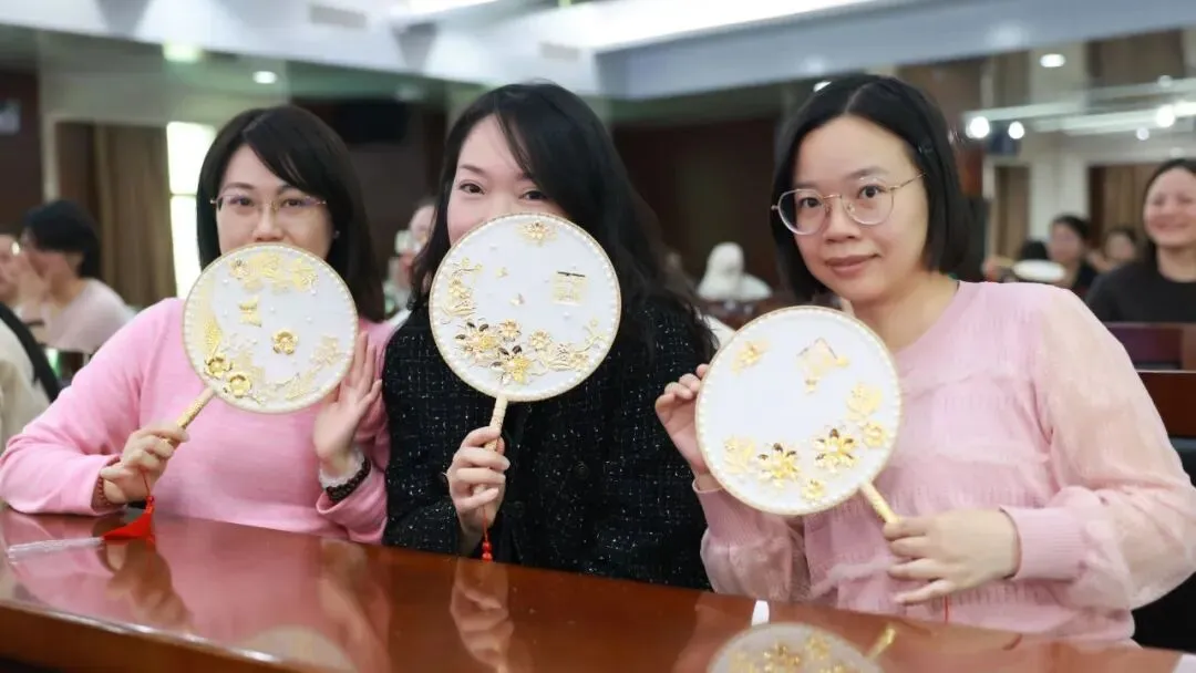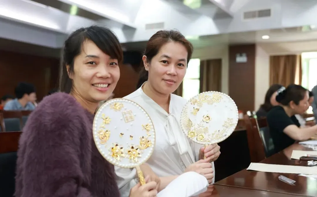 随后,专业手工老师为大家讲解了团扇的历史渊源、文化内涵及制作技巧。在老师的指导下,大家纷纷拿起手中的材料,发挥创意,认真构图、细心粘贴,将一颗颗珍珠等装饰物点缀在扇面上。