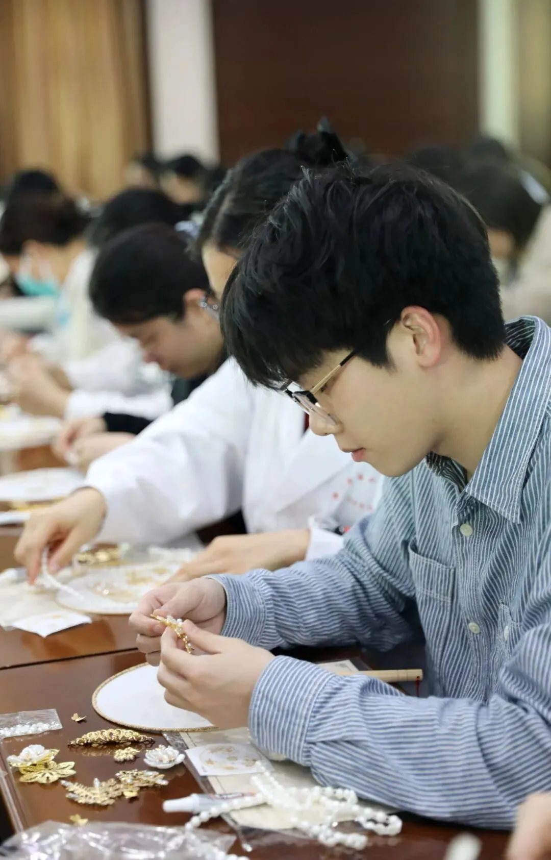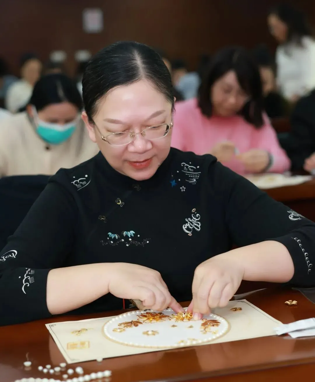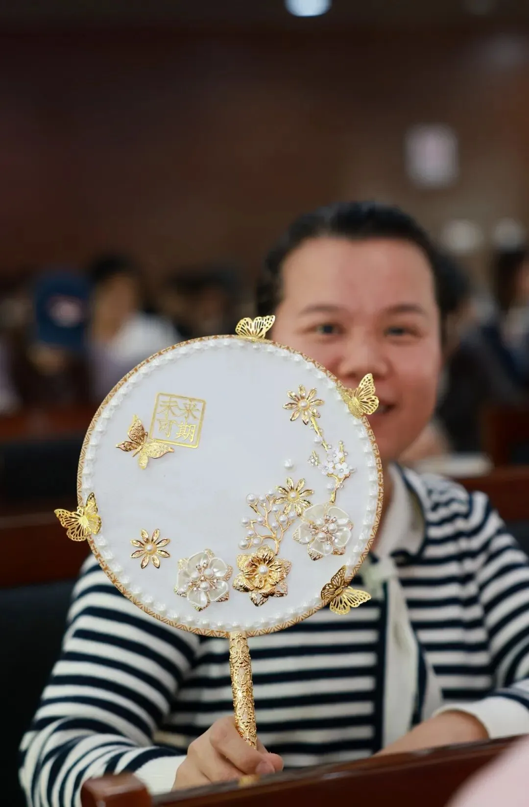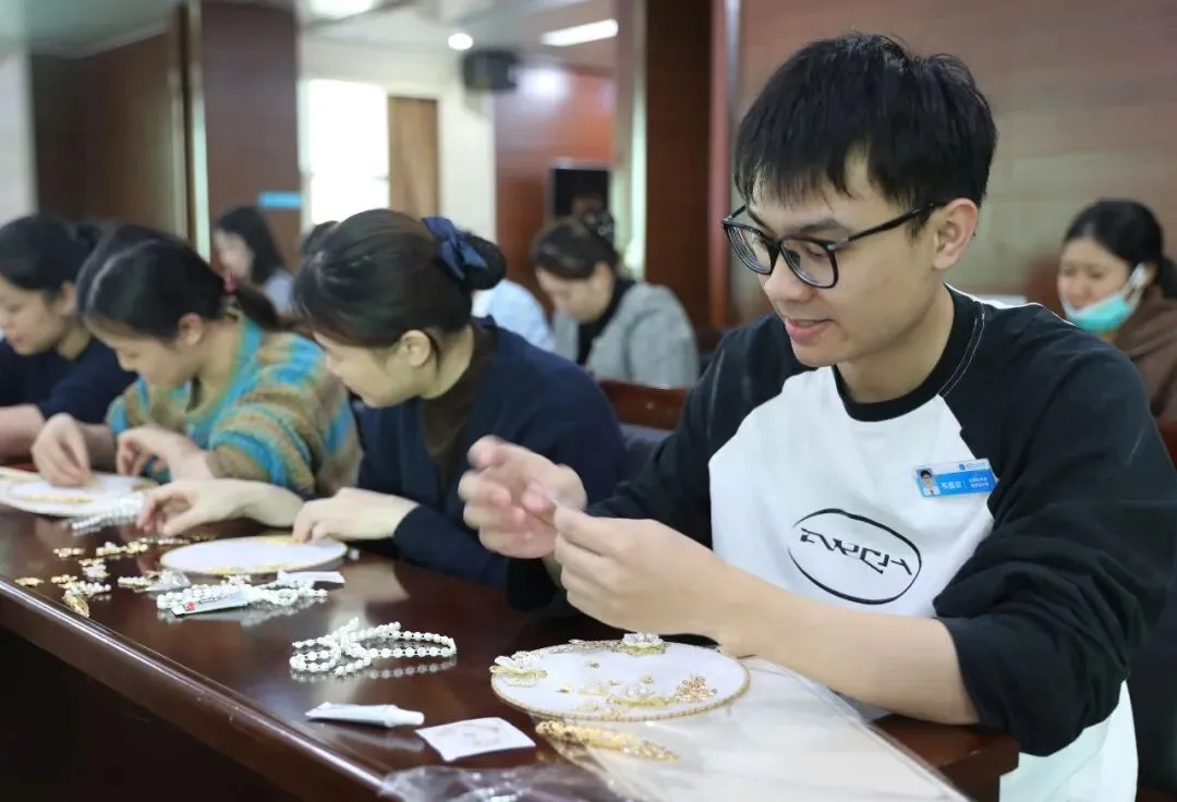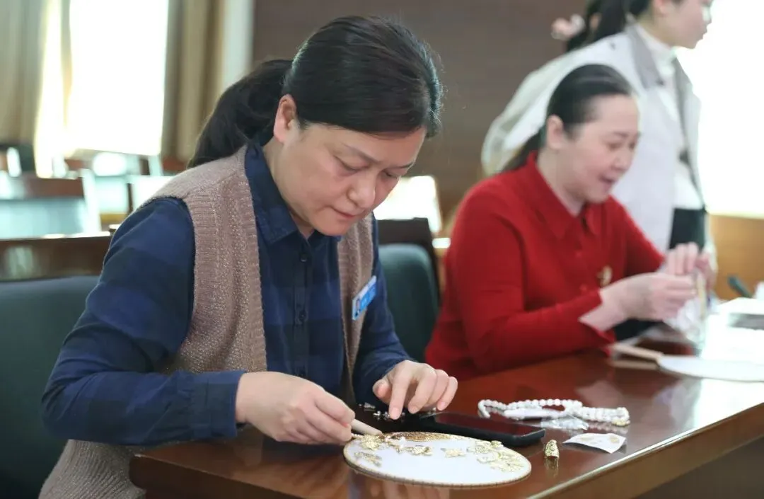 随后,专业手工老师为大家讲解了团扇的历史渊源、文化内涵及制作技巧。在老师的指导下,大家纷纷拿起手中的材料,发挥创意,认真构图、细心粘贴,将一颗颗珍珠等装饰物点缀在扇面上。
