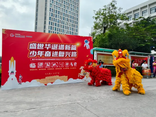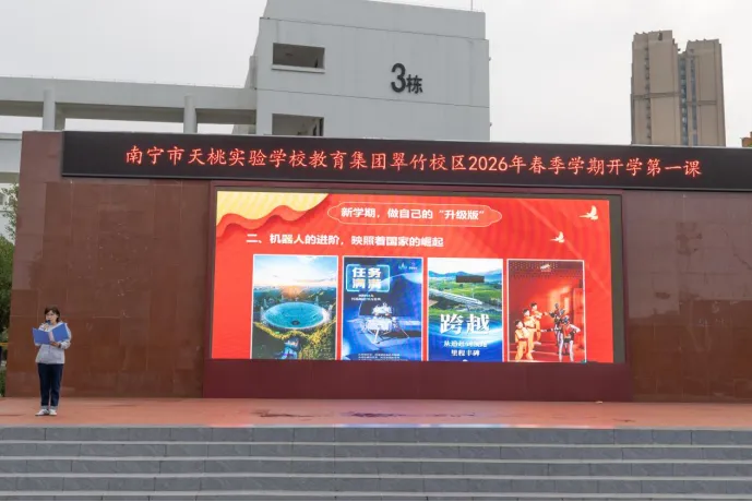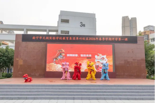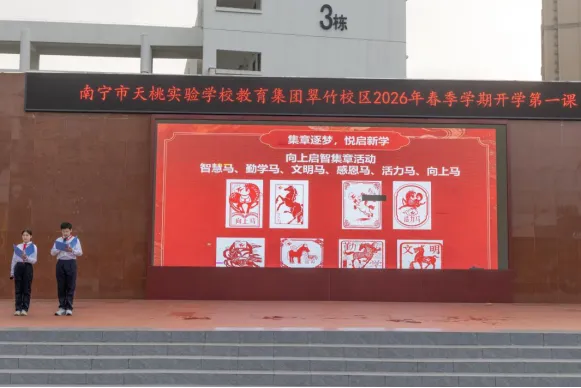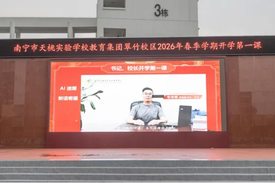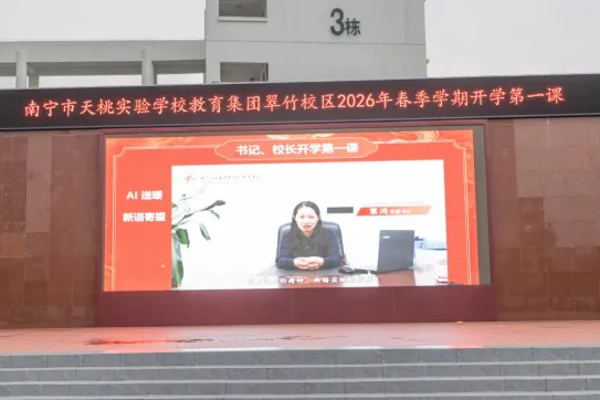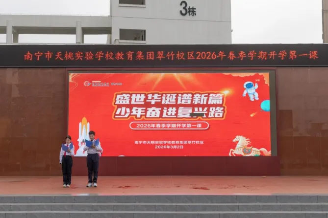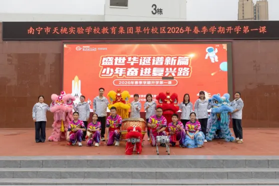 春风送暖,万象更新。2026年3月2日上午,南宁市天桃实验学校翠竹校区以“盛世华诞谱新篇,少年奋进复兴路”为主题,隆重举行2026年春季开学第一课主题活动。活动融合传统与科技元素,亮点纷呈,在庄重的仪式感与鲜活的互动中,开启了新学期的奋进篇章。