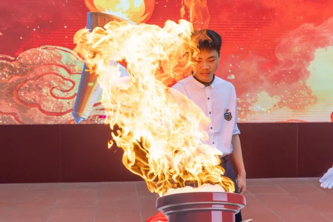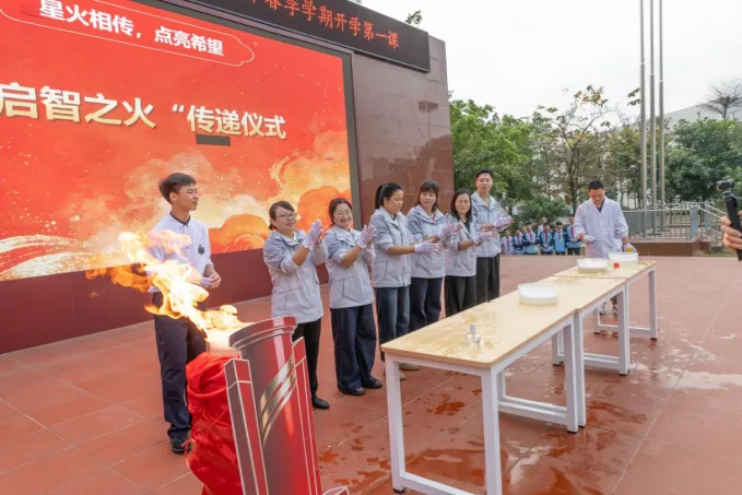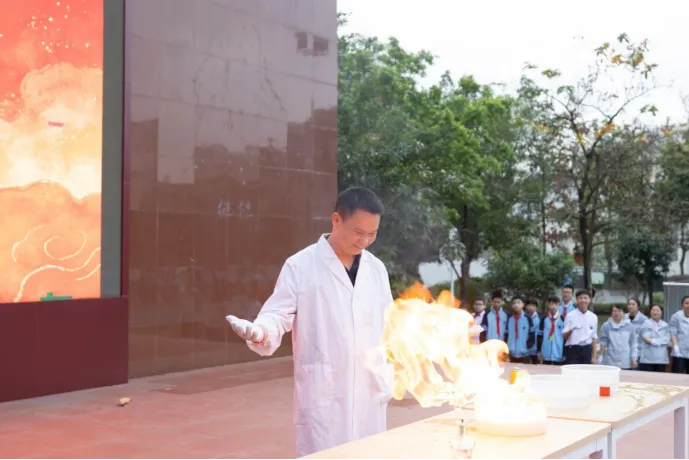 随后,化学组陶流鸿老师带来了精彩的“掌上火”表演,象征希望的火焰在黄涛副校长以及各年级组长手中依次传递,最终由一名学生代表点燃了开学希望的火炬,寓意着精神与使命的代代相传。