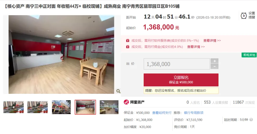 这次的标的物妥妥的是核心资产,拍卖的是南宁青秀区翡翠园Ⅱ区B105铺,是一次商拍而非法拍。这个商铺的面积是553.4平米,是在一排临街商铺的2楼,目前是带租约的,月租金是37495元,算下来一年是44.99万,也就差不多50万了,而且这个租金是递增的哦,租期到2027年的9月底。这个地段虽然是2楼,但依旧有着较大的商业价值,首先该商铺位于青秀的核心区,东盟商务区旁边,最重要的是正对面是南宁三中初中部青秀校区。广西的家长对南宁三中一定有所耳闻,这所学校在南宁市排在第一梯队的,在整个广西也是顶尖的存在,所以学校不会缺学生,而且家长也舍得花钱培养孩子,在这里做教培是相当合适。其实目前该商铺的承租方也是一家做托管教培性质的,如果到现场你会看到,整条街已经形成了成熟的教培产业集群,成行成市,基本上不缺租客。且该校的在校生超4700人,办学规模有89个班,如果是做托管相当可以。除此之外,该铺距离一号线地铁琅东客运站大概1公里,凤岭站1.2公里左右,相当近,人流量不小,公交就更不用说了,附近有好几个公交站台。除了南宁三中,这附近还有南宁翡翠园学校,林里桥中段小学,桂雅路小学桂花校区等,教育氛围浓厚,师生客流很稳定。此外,这里的其他配套设施也不差,紧邻大型商场,华丰城爱琴海城市广场、鼎丰广场、万象城、山姆会员店等,都在3公里之内,买个菜还有铜鼓岭综合农贸市场,距离500米左右。医疗资源也同样较多,不管是社区医院还是大医院,都不远。一般在顶尖学校旁边,高端小区都少不了,而且居住密度较高,加上这边有东盟商务区写字楼群聚,上班族也不少。总的来讲,该铺所处位置相当不错,要说缺点,那可能就是该商铺位于二楼,不如临街的一楼好,不过在学校对面,如果做托管教培还是二楼更合适。该商铺的评估价高达751万,但起拍价只要136.8万,对比起来就很低了,如果有能力的可以实地考察然后再决定。距离正式开拍还有12天的时间,目前已经吸引了上万次的围观,热度非常高,大家都想看看到底有多少人能拿下这个商铺。还有一点,就是成交后还要另外支付软件服务费以及另附佣金哦,具体的可以参考拍卖页面。