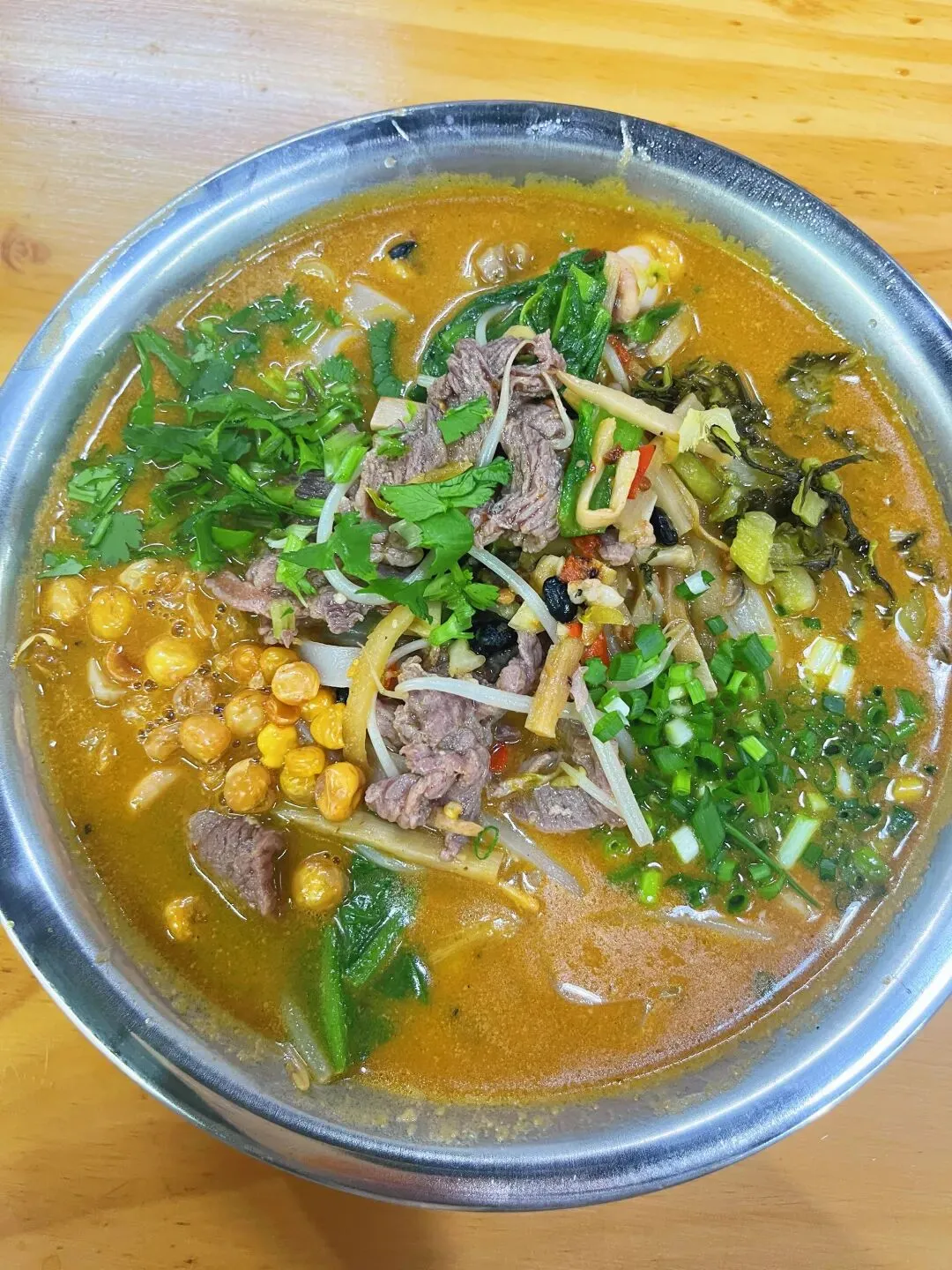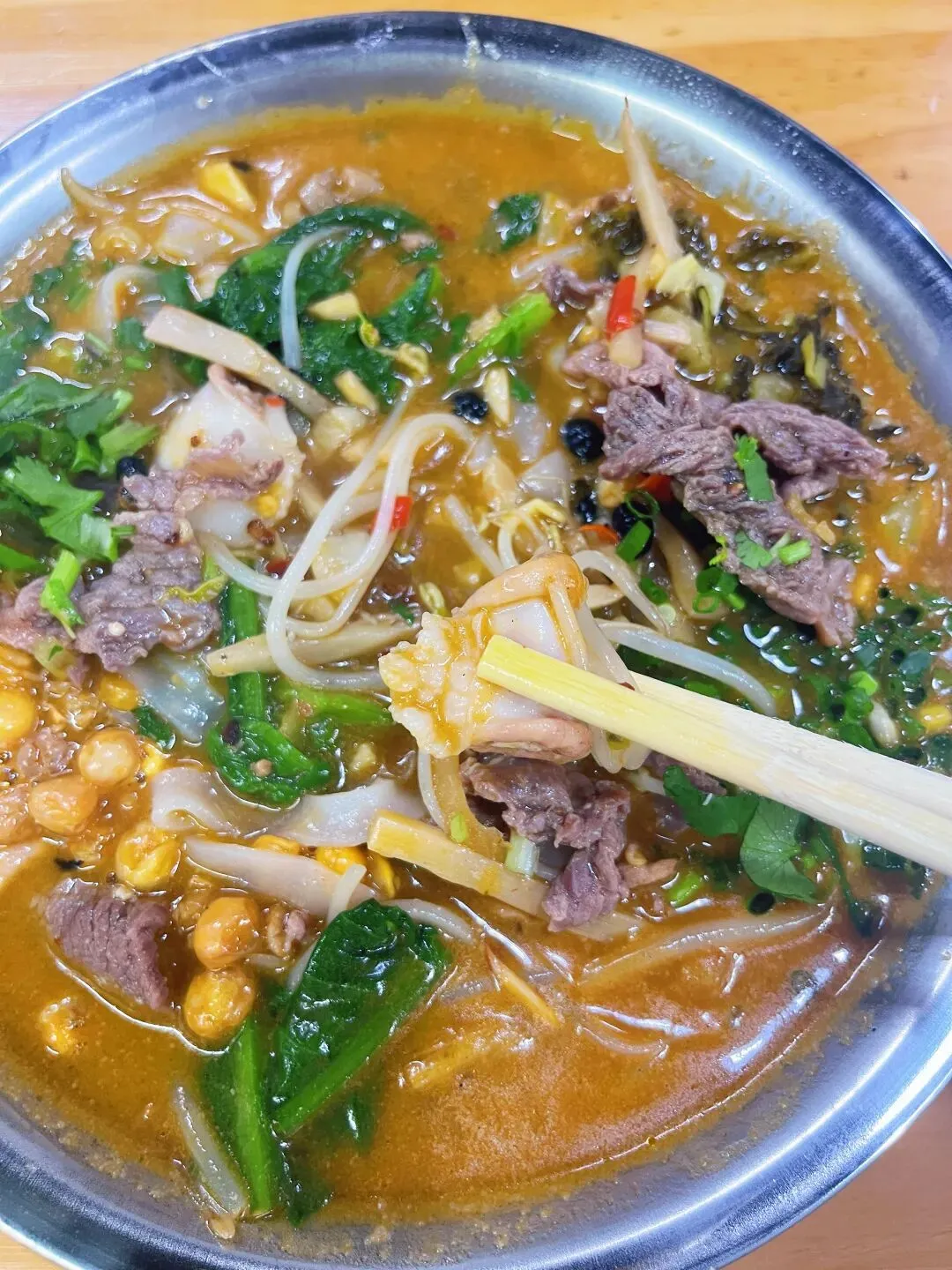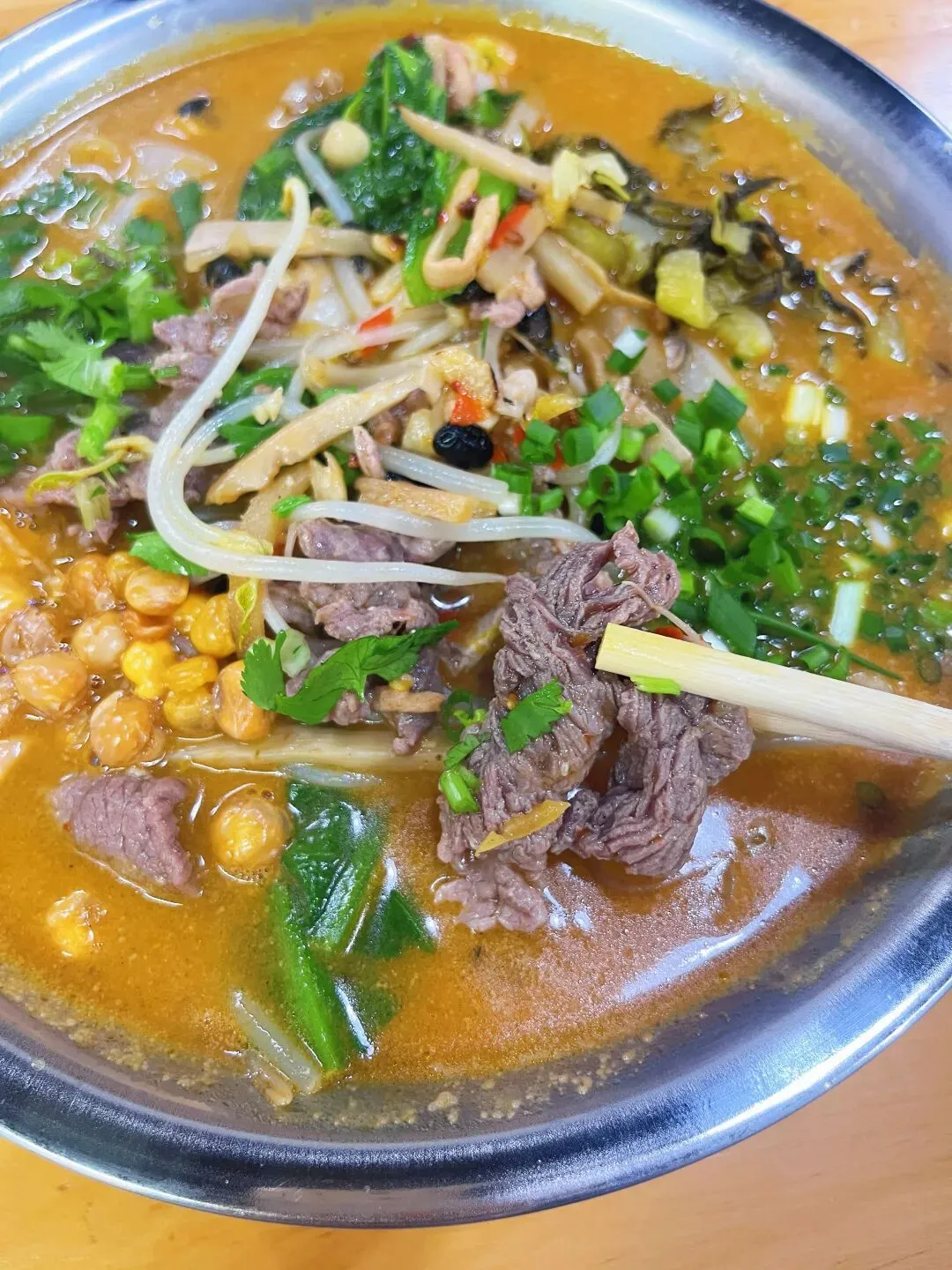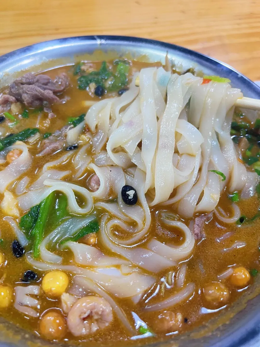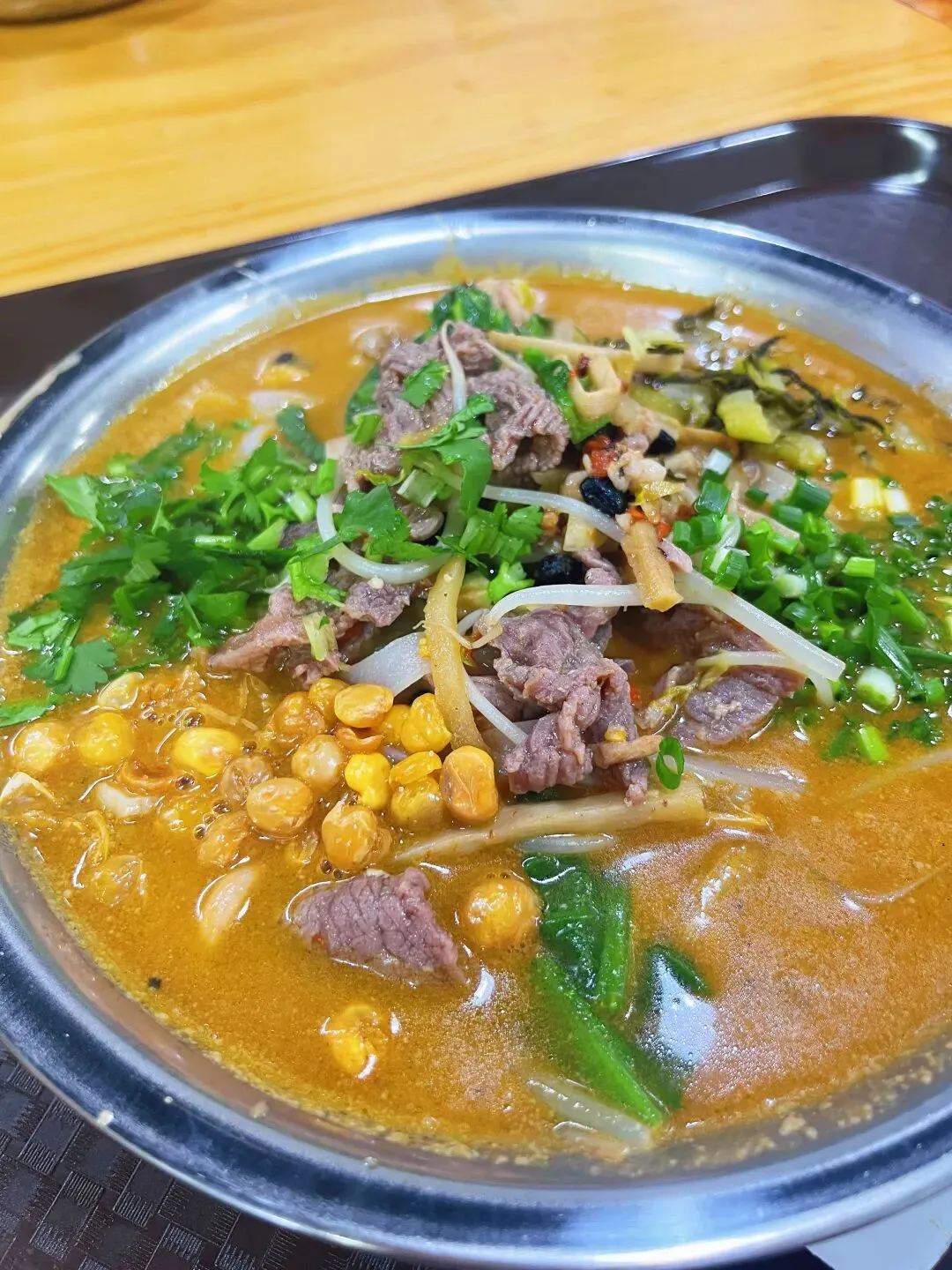 说起南宁的老友粉,这家店应该在整个南宁也是排上号的,早就听身边朋友推荐很多次了,我也惦记了好久,终于也吃上了。粉得老店在柳沙,我吃的是东盟商务区的分店(店名地址文末附上)。中午饭点人还挺多的,拿料的时候需要小排一下队,但好在有序所以也没等多久。一进门就看到一排冰柜,里面满满当当都是生料,上面都标注好价格了,想吃什么就拿什么。这种“生料自选”模式,在网上确实有不少争议,有人吐槽说这样算下来比普通老友粉店贵。但我觉得丰俭由人,各取所需。比如我,特别爱吃老友猪杂,但偏偏对猪肝爱不起来,每次点都会剩,心里还挺过意不去。在这儿就完美解决了,这样自选我就可以只选我喜欢的粉肠,只能说每种方式都有自己的优势吧。拿生料的时候记得拿豆豉酸笋,如果不拿会默认生料煮法,不是老友味的哦。拿好自己喜欢吃的生料跟着人群走到口味自选区,重锅气、轻锅气、重酸、少酸、多辣、少辣……各种小牌牌摆在篮子里。只需要把你想吃的味道牌牌拿到托盘里,去结账即可,豆芽和青菜是免费的,我也各加了一份,付完款,拿号等叫号。出餐口超大,能看到后厨几位师傅同时开火,锅铲翻飞,炉火熊熊,白烟升腾,整个场面热火朝天。光看着,肚子就更饿了。我这一份加了牛肉、花肠、粉肠共22元,料还是很足的,牛肉嫩滑不柴,花肠和粉肠处理得非常干净,咬下去“嘎吱”作响,脆爽弹牙。生料最怕的就是煮过头发硬,他们家火候拿捏得刚刚好,每一口都鲜脆多汁。最让我惊艳的,是汤底。色泽偏金黄,看着就很有食欲。我选的是少酸口味,汤喝起来温润顺口,酸味不冲,恰到好处地衬托出骨汤的鲜甜。锅气选的是重锅气,香气浓郁却不霸道,余味里带着锅气的焦香。搭配上自己选的生料、自己定的口味,大满足!店名:粉得老友粉面自选生料(南宁市青秀区中新路8-1-22号)