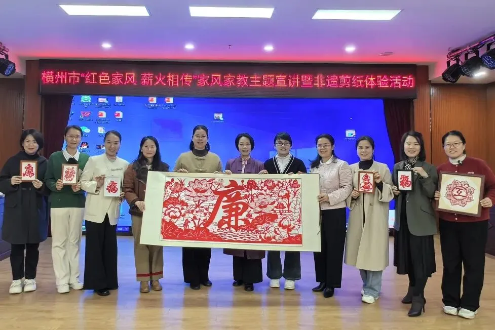 3月4日,横州市妇联举办“红色家风 薪火相传”家风家教主题宣讲暨非遗剪纸体验活动,以红色文化铸魂,以非遗技艺传情,引导广大女干部涵养优良家风、践行家庭美德。来自各乡镇妇联主席、市直单位女干部代表共80人参加。此次活动将理论宣讲与实践体验有机结合,既丰富了女干部精神文化生活,也为推进清廉家庭建设、传承中华优秀传统文化注入新活力。
