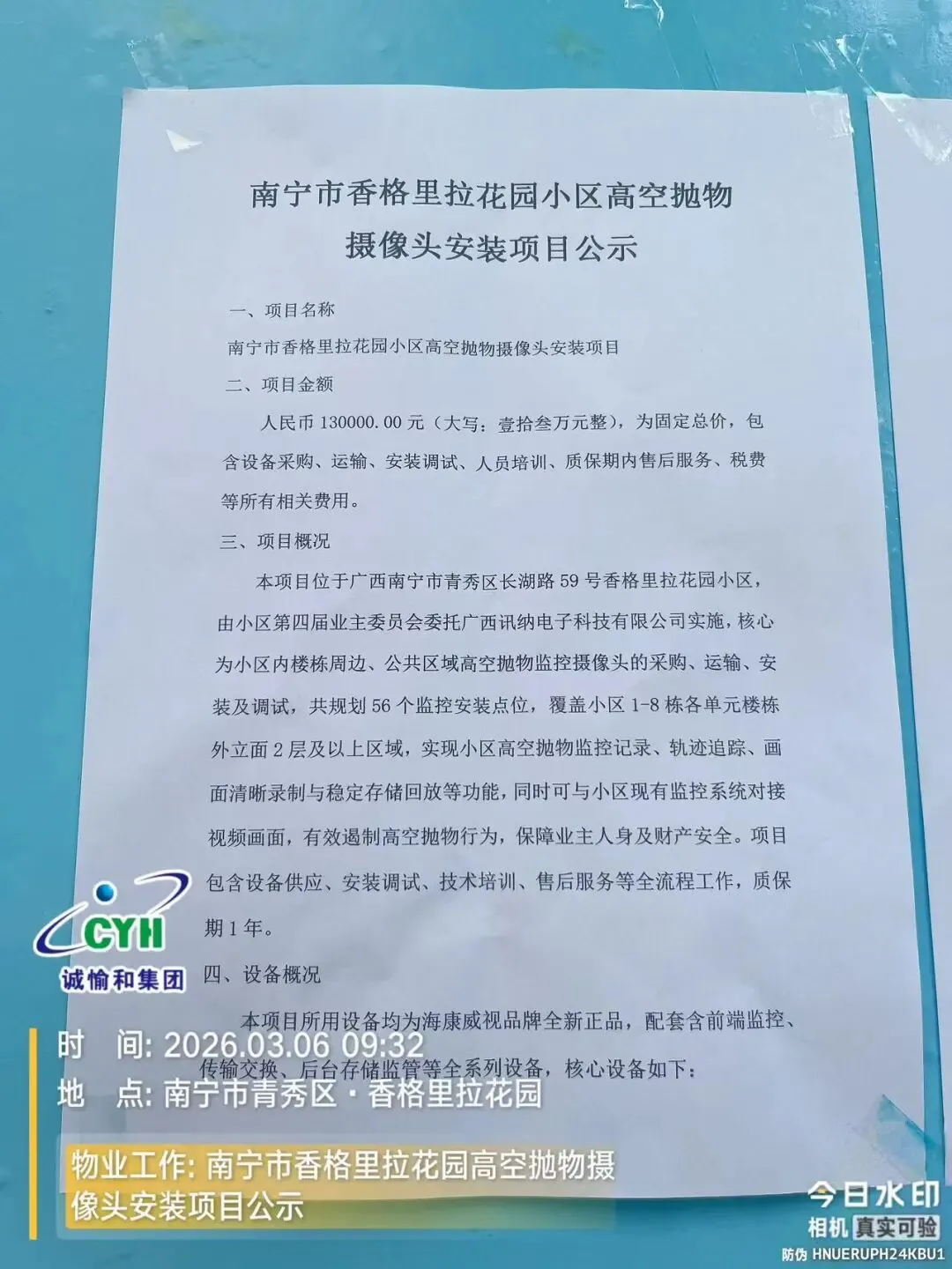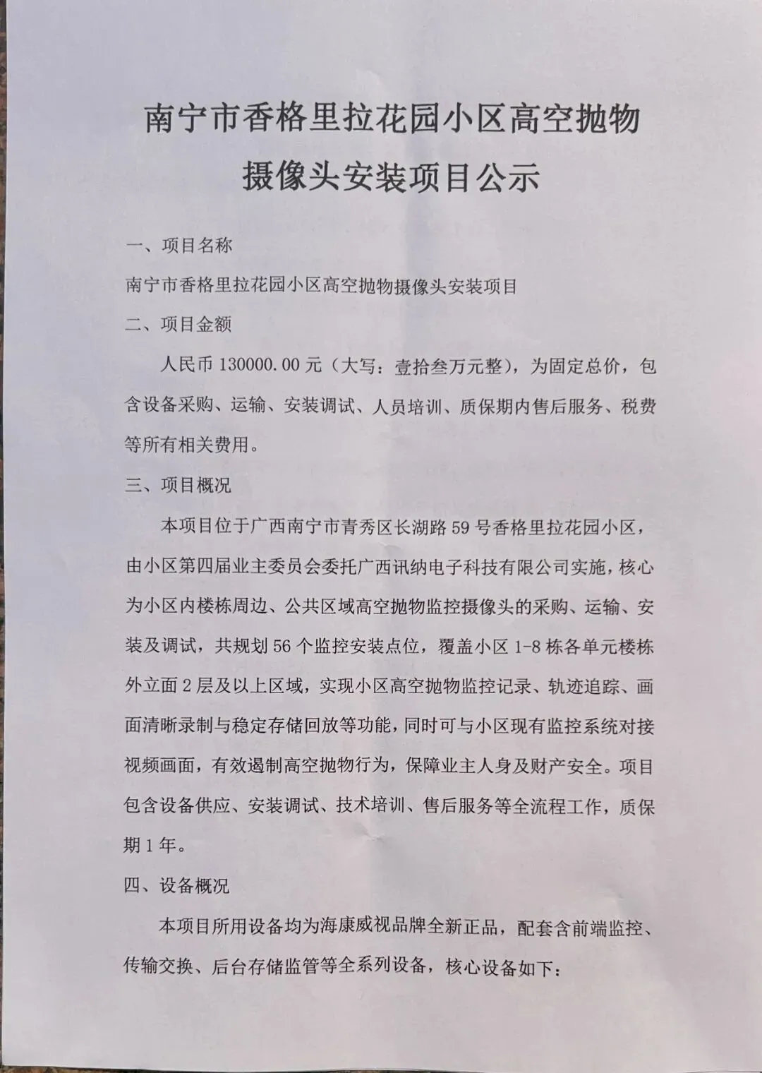 本项目位于广西南宁市青秀区长湖路59号香格里拉花园小区,由小区第四届业主委员会委托广西讯纳电子科技有限公司实施,核心为小区内楼栋周边,公共区域高空抛物监控摄像头的采购,运输,安装及调试,共规划56个监控安装点位,覆盖小区1-8栋各单元楼栋外立面2层及以上区域,实现小区高空抛物监控记录,轨迹追踪,画面清晰录制与稳定存储回放等功能,同时可与小区现有监控系统对接视频画面,有效遏制高空抛物行为,保障业主人身及财产安全。项目包含设备供应,安装调试,技术培训,售后服务等全流程工作,质保期1年。