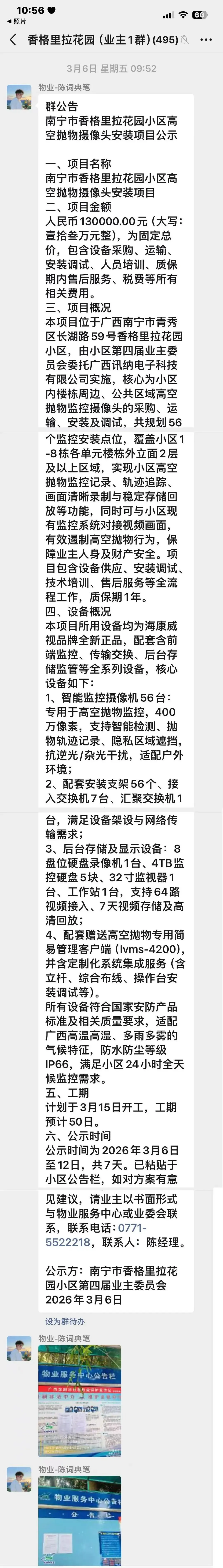 公示时间为2026年3月6日至12日,共7天。已粘贴于小区公告栏,如对方案有意见建议,请业主以书面形式与物业服务中心或业委会联系,联系电话:0771-5522218,联系人:陈经理。