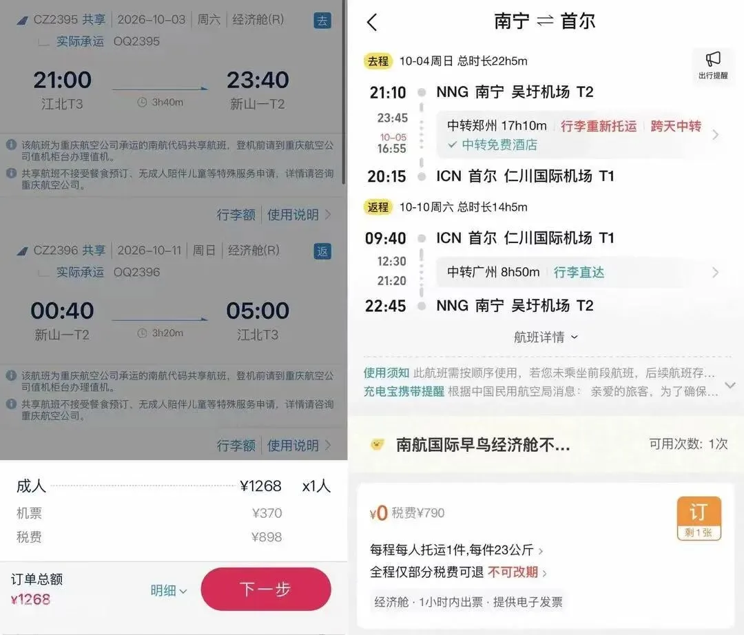 之前一直忘记发,现在借着这个机会先发吧,毕竟这个航线可能新航季就没了🤣目前每周三一班南航放出了9月后的年底国际特价票,南宁放的是首尔特价票(广州中转),次卡的价格是450,税费在790,总体价格在1240这样。小程序和飞猪都可以购买感谢群友@🎙Link(禁言中)实测跨国庆末尾可以用南航还有每日优惠可以领