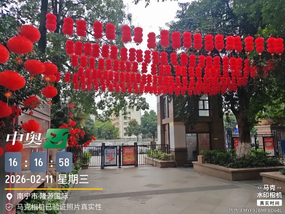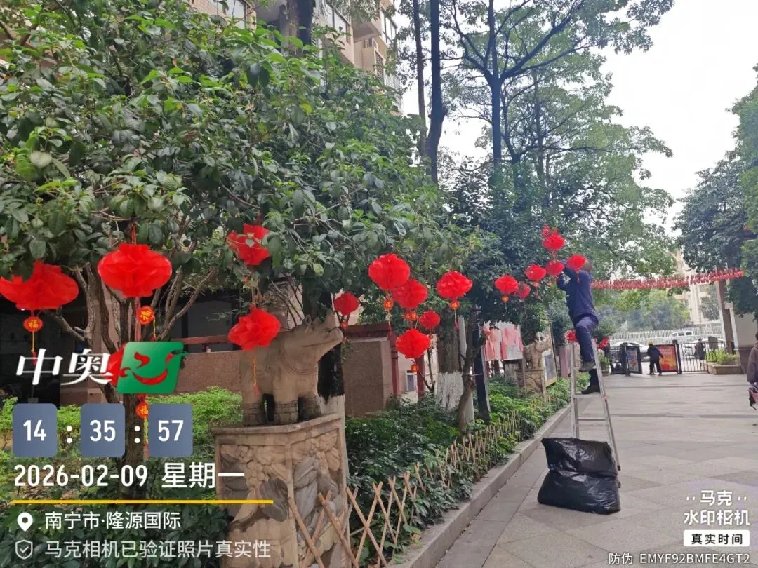 为丰富业主社区文化生活,构建睦邻友善的友好社区,2026年2月,我们举办了1场社区文化活动,春节园区布置。在园区挂灯笼,春节给园区布置。每个单元贴对联,小区树枝上挂灯笼。“和谐奋进,展望新年”新年新气象。