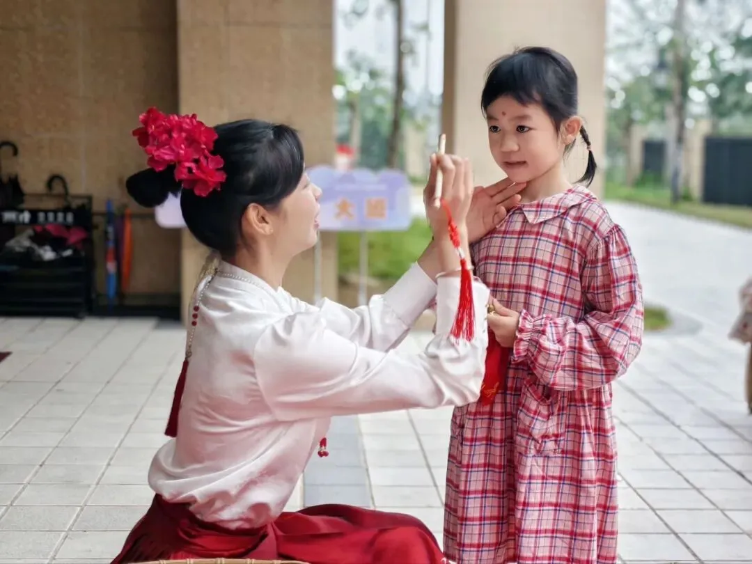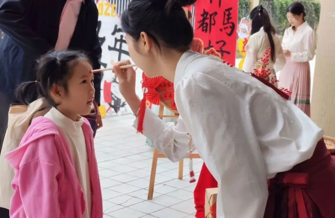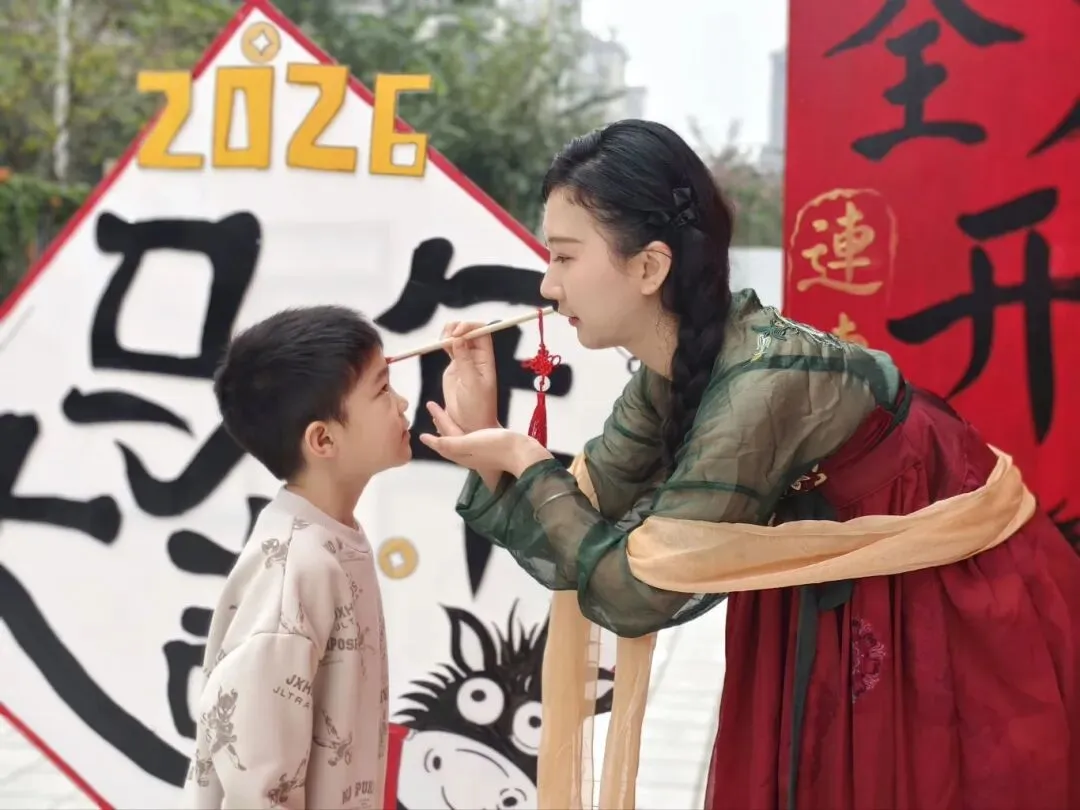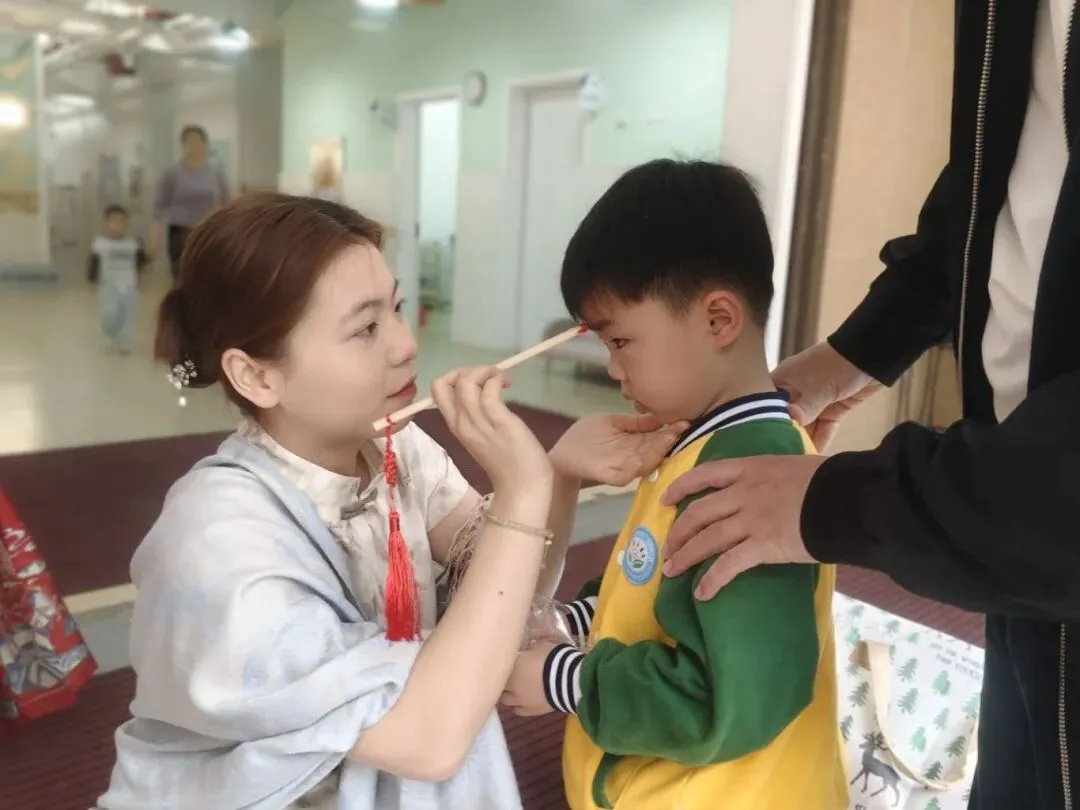开学仪式的第一重惊喜,便是承载着“朱砂启智”美好寓意的点痣环节。老师们手持朱砂笔,在孩子们的额头正中点上一颗红亮的“聪明痣”,轻声叮嘱:“宝贝,新的一年要眼明心亮,快乐成长哦!”一颗颗小红痣,既是传统文化的传承,更是园所对孩子们聪慧明理、乐学善思的深深期许。