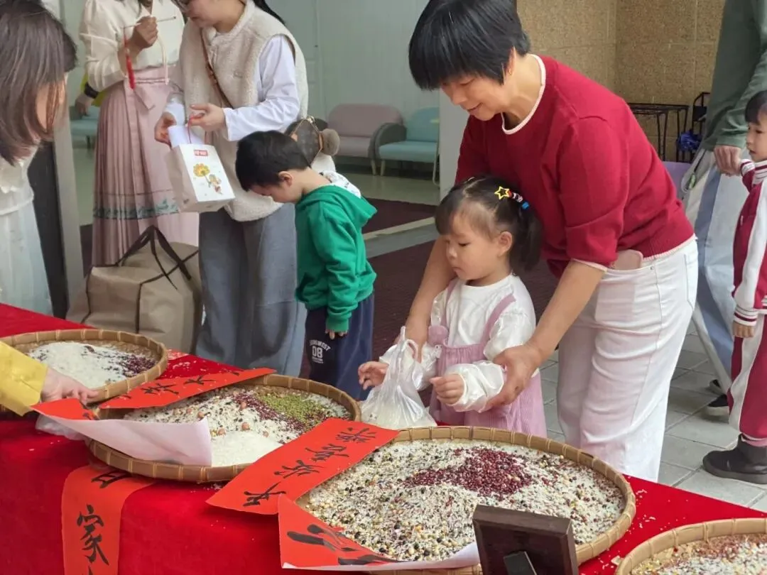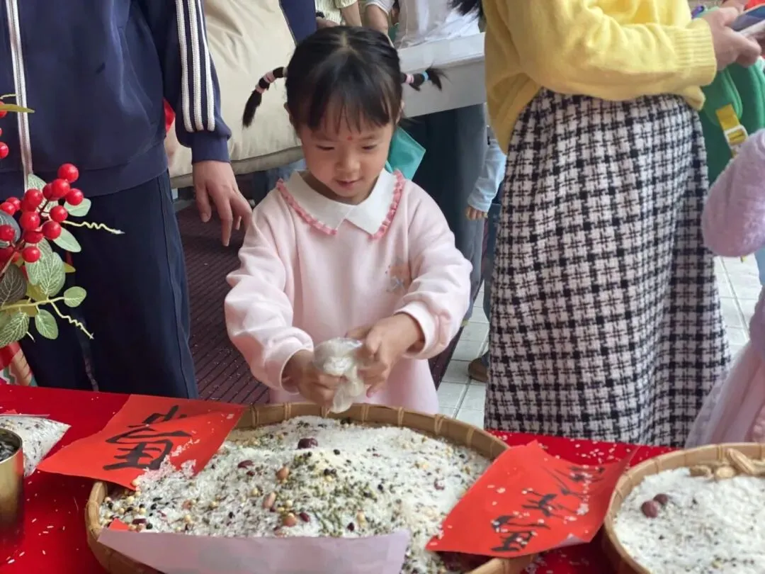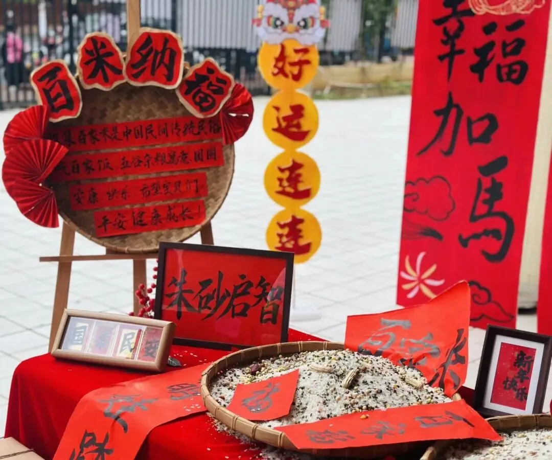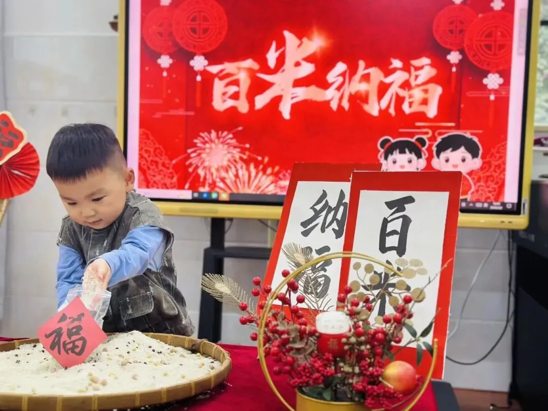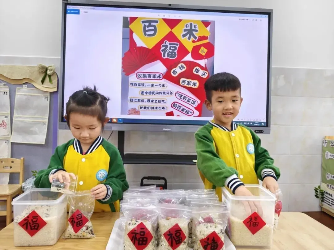 集百家米起源于宋朝,当小孩满周岁时,大人都会抱着小孩到各家各户收集百家米,然后将米带回煮成稀饭,让孩子吃下,这样孩子就会受到百家庇护,消灾祛病、保佑安康。集百家米熬粥,也是此寓意。此活动让幼儿充分了解中国传统的民俗,感受传统文化的魅力。