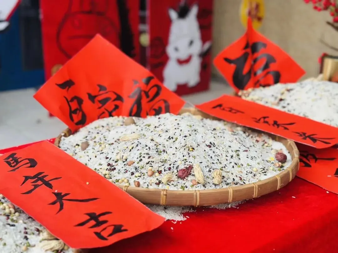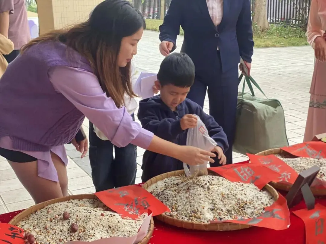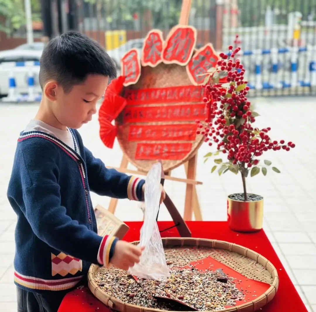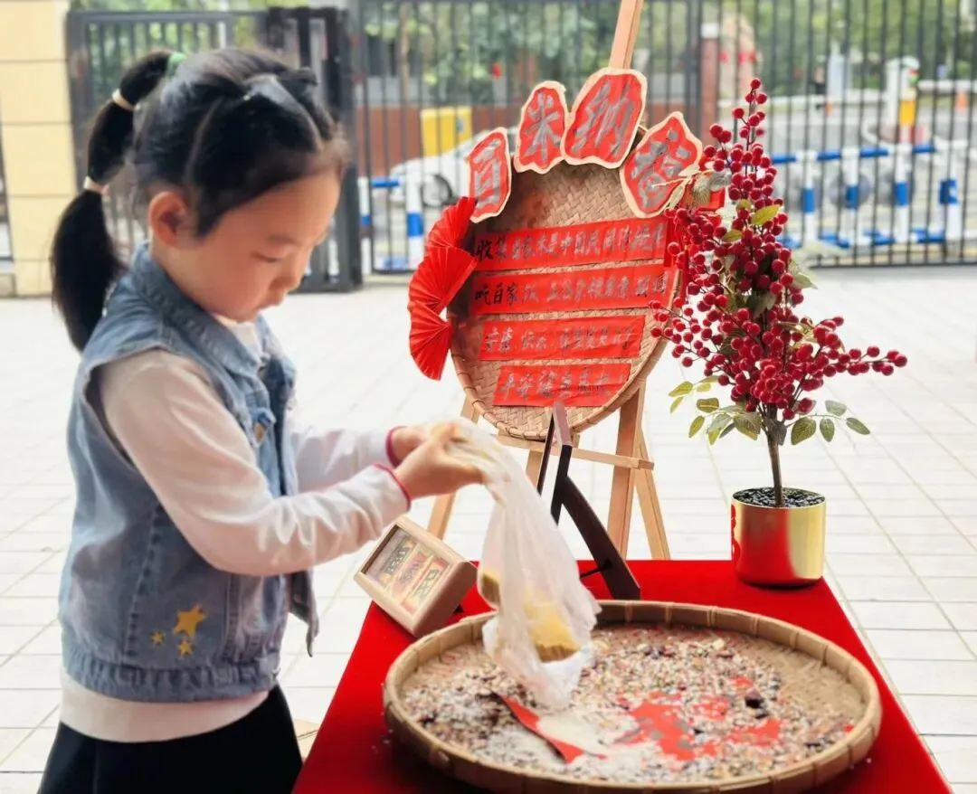 集百家米起源于宋朝,当小孩满周岁时,大人都会抱着小孩到各家各户收集百家米,然后将米带回煮成稀饭,让孩子吃下,这样孩子就会受到百家庇护,消灾祛病、保佑安康。集百家米熬粥,也是此寓意。此活动让幼儿充分了解中国传统的民俗,感受传统文化的魅力。