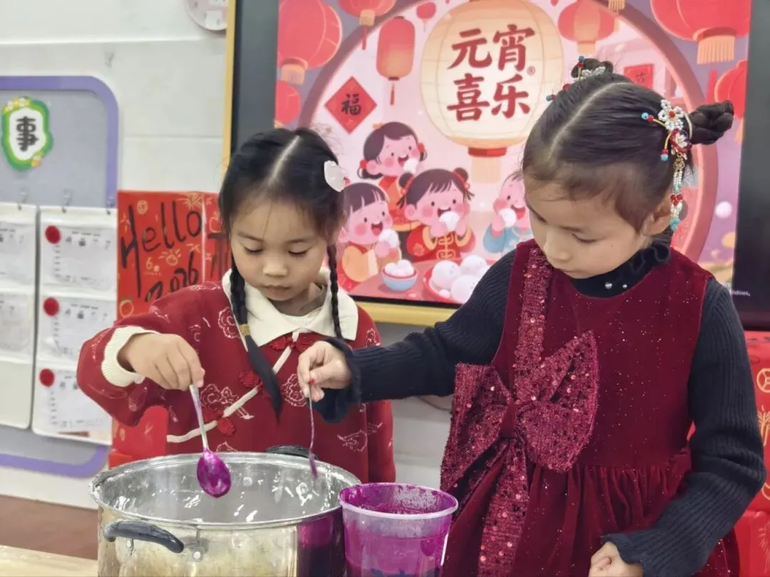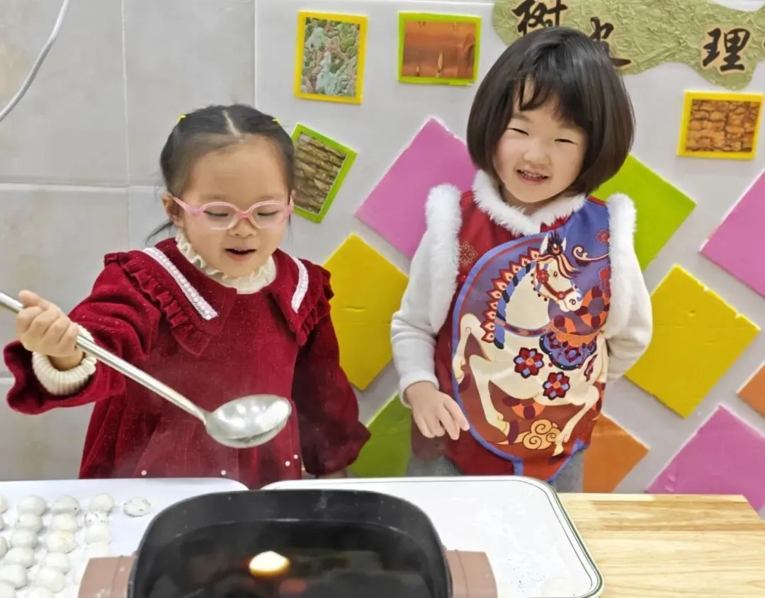 锅中加水烧冒泡,圆圆汤圆下锅啦,咕嘟咕嘟慢慢摇。软软的汤圆浮起时,红糖的甜香味弥漫整个教室。