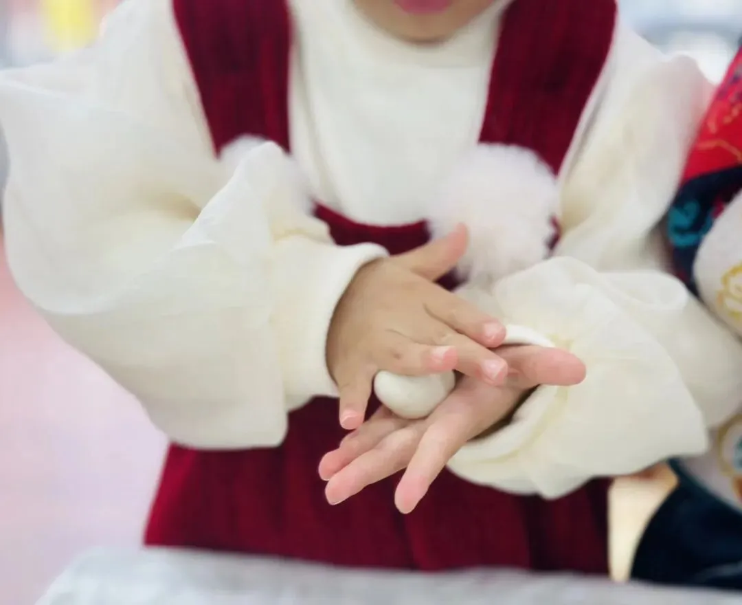 让我们一起来尝试一下做汤圆吧,第一步,揪一小团面团放在手心;第二步,两只手轻轻揉搓汤圆让它成为一个小圆团;第三步,用手指搓开一个小洞,加上适当馅料,封边再次搓圆,美味汤圆就做好啦。