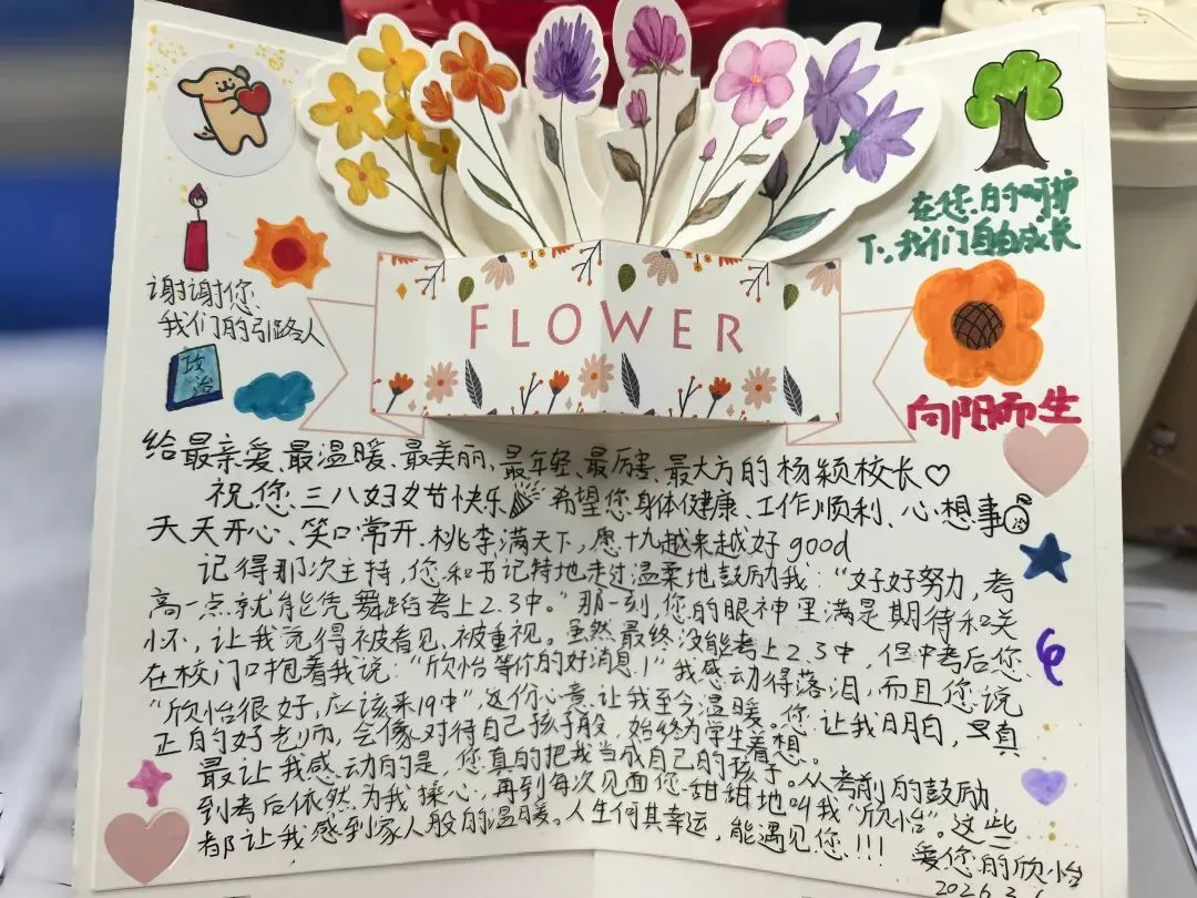 上午7:30,学生代表在校门躬身献花,主题花墙开放供打卡留念;此前还开展花束创意绘画活动,学生在定制明信片上创作专属作品并赠予教职工,优秀作品同步展出,让女教职工感受到学生们的温暖与敬意,弘扬尊重女性、崇尚奉献的校园新风尚,为校园文化建设增添了温暖底色。