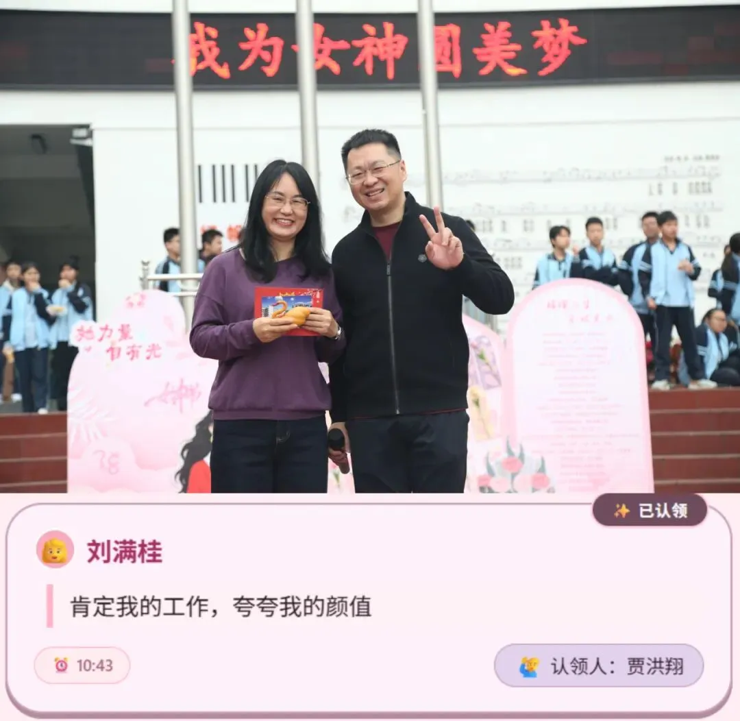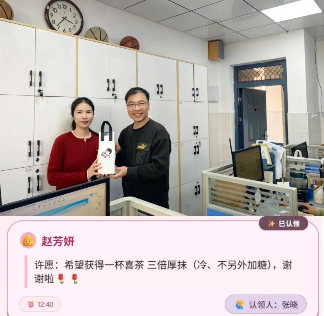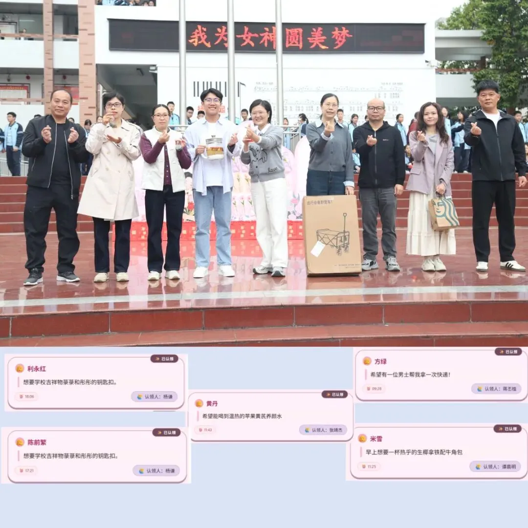 本次活动的暖心亮点,莫过于“我为女神圆美梦”环节。学校将征集到女神们的心愿,由男神们认领后一一兑现。热乎的奶茶、香醇的咖啡、精致的暖心早餐送到女职工手中,可爱的纪念钥匙扣成为专属小惊喜,沉重的快递及时代取、精美的绘本悉心送上,主动代上一节课、贴心看护晚自习……,让一个个看似微小的心愿,都化作触手可及的温暖与美好。每一个心愿的兑现,都让女职工们连日工作的疲惫随之一扫而空,脸上满是轻松与惬意,心中漾起阵阵暖意,一张张笑脸绽放着幸福与满足,这份被看见、被惦念的温暖,成为这个节日里最珍贵的礼物。
