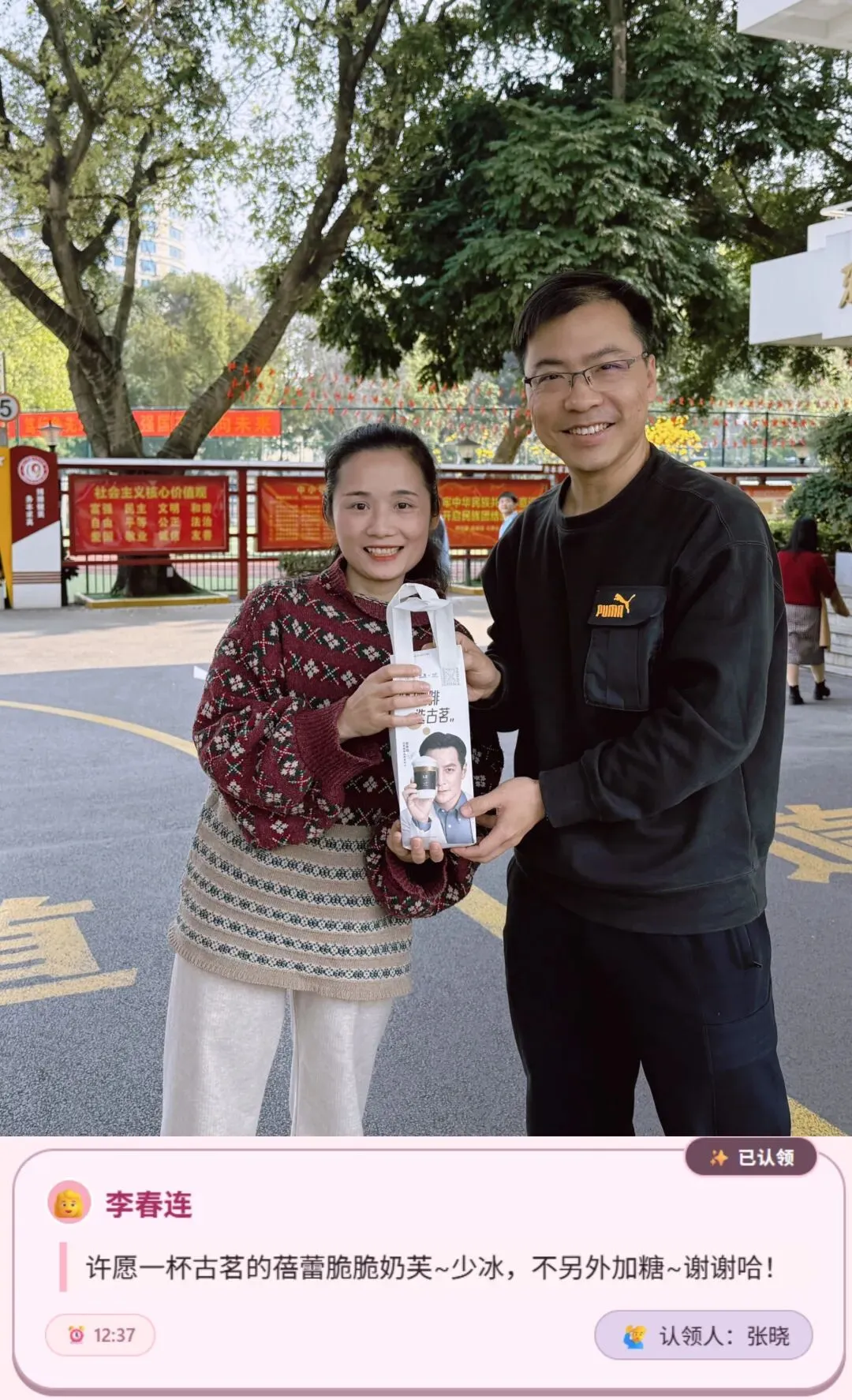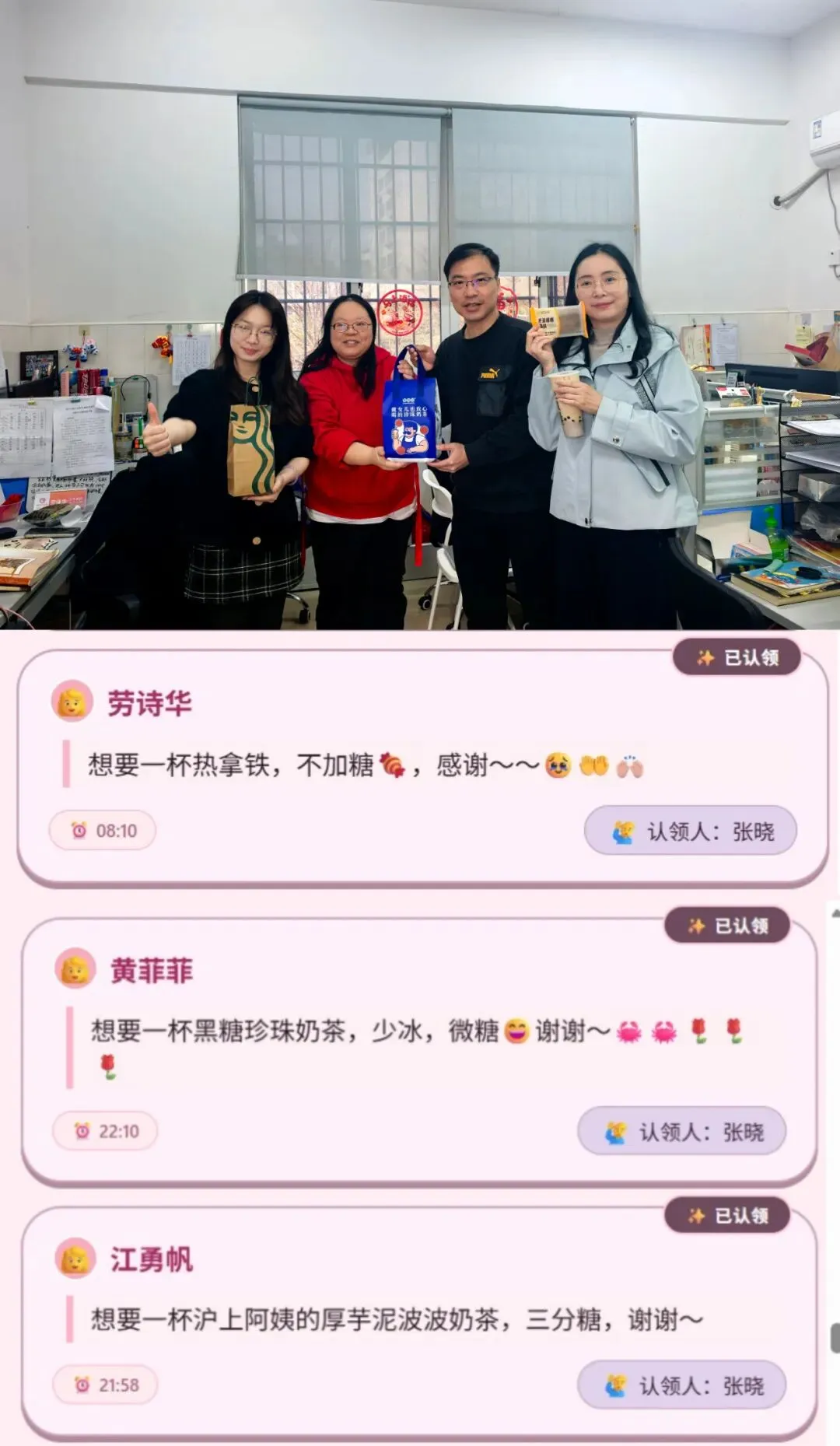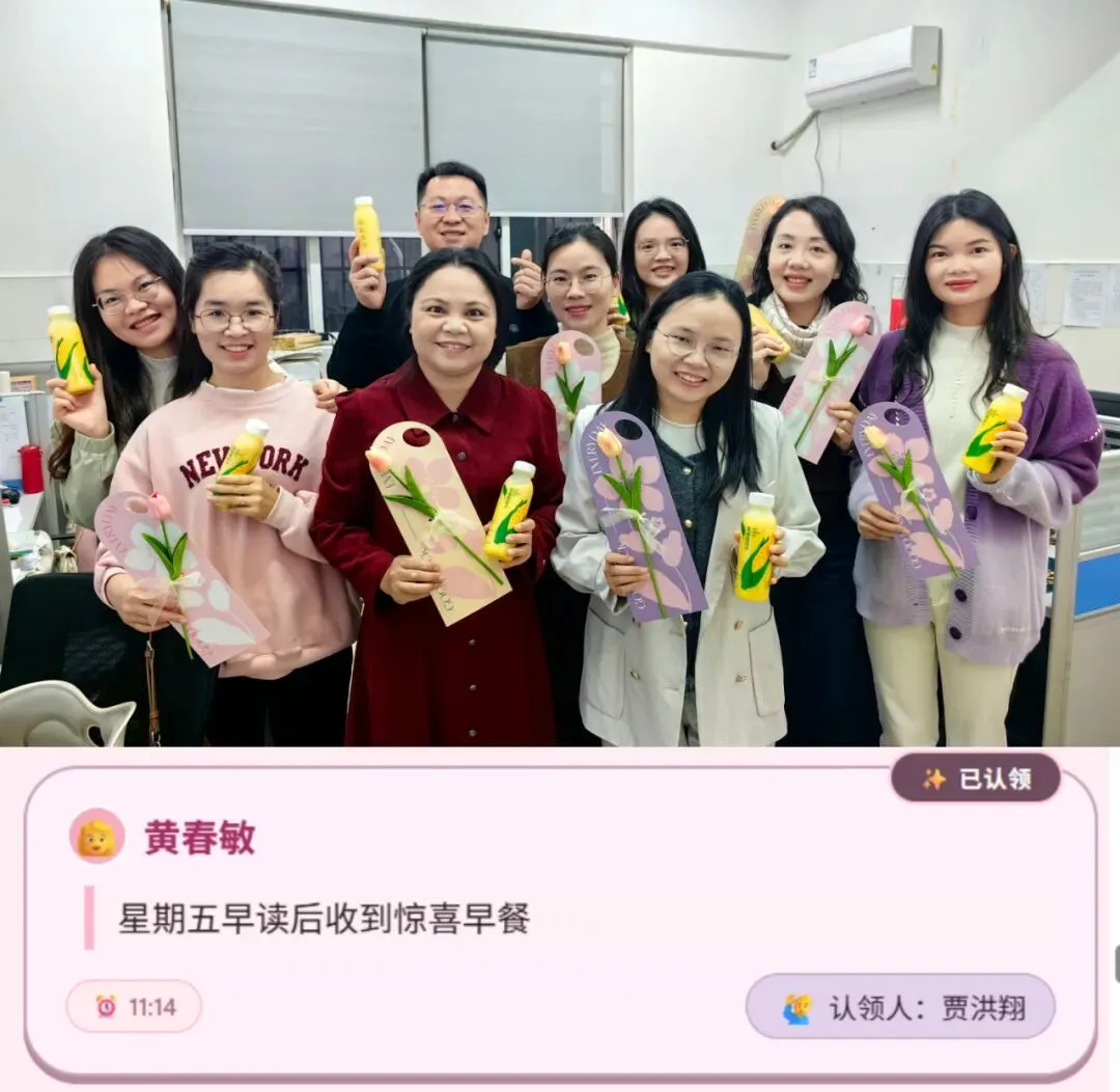 本次活动的暖心亮点,莫过于“我为女神圆美梦”环节。学校将征集到女神们的心愿,由男神们认领后一一兑现。热乎的奶茶、香醇的咖啡、精致的暖心早餐送到女职工手中,可爱的纪念钥匙扣成为专属小惊喜,沉重的快递及时代取、精美的绘本悉心送上,主动代上一节课、贴心看护晚自习……,让一个个看似微小的心愿,都化作触手可及的温暖与美好。每一个心愿的兑现,都让女职工们连日工作的疲惫随之一扫而空,脸上满是轻松与惬意,心中漾起阵阵暖意,一张张笑脸绽放着幸福与满足,这份被看见、被惦念的温暖,成为这个节日里最珍贵的礼物。