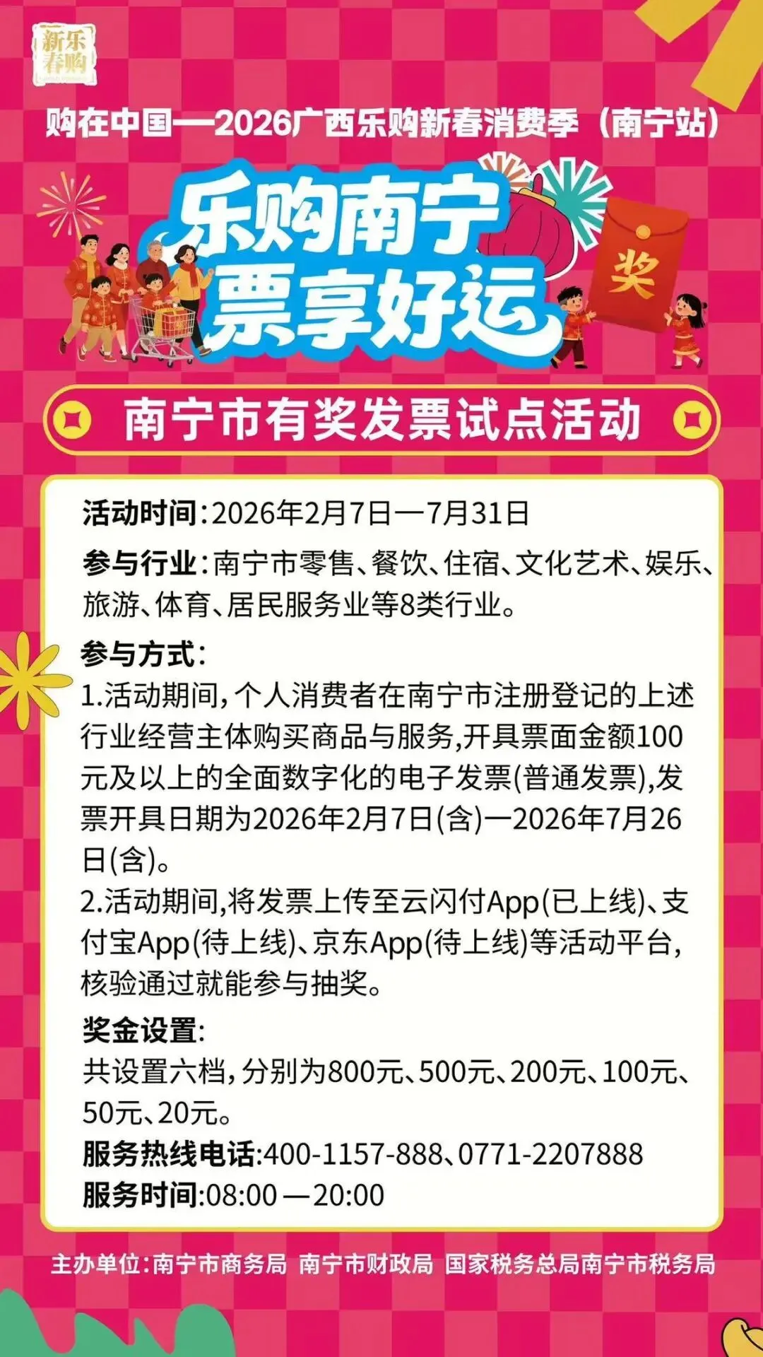 开奖现场,工作人员从2月27日至3月5日期间上传并核验通过的数电发票中,随机抽取中奖发票,共抽出中奖发票7.2万余张,其中,800元奖项有272张,500元奖项有872张,200元奖项有3272张;100元奖项有超1.3万张,50元奖项有超2万张,20元奖项有超3万张,中奖奖金超436万元。数据显示,本期参与上传发票数量超23万张,上传发票数量和中奖发票数量双双创历次新高。随着活动深入推进,南宁市民消费习惯悄然转变:从“被动开发票”变为“主动索取发票”,从“嫌麻烦不开票”转为“消费必开发票”。记者走访了解到,各大商超、餐饮门店内,消费者结账时主动咨询数电发票开具及上传方式的人数明显增多,商家也积极引导参与抽奖,形成“商家规范开发票、消费者主动索取发票”的良性互动。本周末恰逢“三八”国际妇女节,南宁各大商圈抢抓“她经济”消费风口,推出一系列主题活动与专属优惠。叠加政府消费券、银行满减及有奖发票活动,节日消费热潮持续升温。3月7日至8日,杉杉奥特莱斯广场推出“三八节宠爱计划”主题活动,飘雪电音派对嗨翻全场,千支玫瑰免费送,ARMANI限时快闪,全场低至2折,即日起至3月9日,会员消费满5000元赠送200元加油卡。200余家品牌旗舰店更同步推出独家折扣与爆款好物。政府消费券、银行满减可与店铺折扣叠加使用,让市民享折上再减的实在福利。3月6日至3月29日,南宁百货大楼朝阳店开展“寻香绘色,共赴春日”主题活动,美妆专柜享全天5倍积分,会员可领取450元美妆福利券,多档满减让利消费者。此外,3月6日至3月15日,其推出的“她力量 绿动新生”主题活动中,主题百货低至8折;3月6—8日、3月13—15日,主题百货满888元收138元春日美衣券;即日起至3月29日,美妆春日红包券免费领。3月7日当天,京东电器推出“亲友答谢会”,家电产品至高直省60%,更有1元抢空调重磅福利,为市民春日焕新提供实惠选择。节日消费旺,好运不缺席。市民在消费时,只要开具含税金额100元及以上的数电发票,通过云闪付App上传即可参与有奖发票抽奖,让节日消费再多一份惊喜。双福利:消费前可领消费券,消费后可参与有奖发票活动为进一步释放消费潜力,南宁市一季度“乐购南宁・马上有福”促消费活动第二期同步开展。3月3日至3月8日每天上午10 点,通过云闪付App发放商超、百货、成品油、餐饮四大类消费券,其中商超券设有满100元减20元至满800元减160元共五档;百货券设有满300元减30元至满2000元减200元共四档;成品油券设有满200元减20元、满300元减30元两档;餐饮券则设有满100元减20元至满2000元减400元共五档。消费券将通过云闪付App每天上午10:00统一发放,在南宁市的消费者可打开手机定位,登录云闪付App,在首页进入“广西消费券”专区,选择“四重礼·各地市政府消费券——南宁市”活动页面即可参与抢券。可与商家折扣、银行满减叠加使用。与此同时,“乐购南宁・票享好运”有奖发票试点活动将持续至7月31日,后续仍将定期开奖,奖金档位保持20元至800元六档不变。个人消费者在零售、餐饮、住宿、文化艺术、娱乐、旅游、体育、居民服务业8类行业消费并开取单张含税金额100元(含)以上的数电发票,通过云闪付APP上传核验通过后可参与抽奖,每张发票仅限参与1次,每位消费者活动期间最多可上传60张不同发票。消费券与有奖发票双管齐下,形成“优惠+抽奖”双重利好。在此呼吁广大市民,消费时主动索要数电发票,积极参与惠民活动,让主动索票成为文明消费新风尚,让惠民红利惠及更多市民。2026年“乐购南宁・票享好运”南宁市有奖发票试点活动第四期中奖名单链接,快去看你有没有中奖!来源:南宁市商务局官网、南宁市融媒体中心