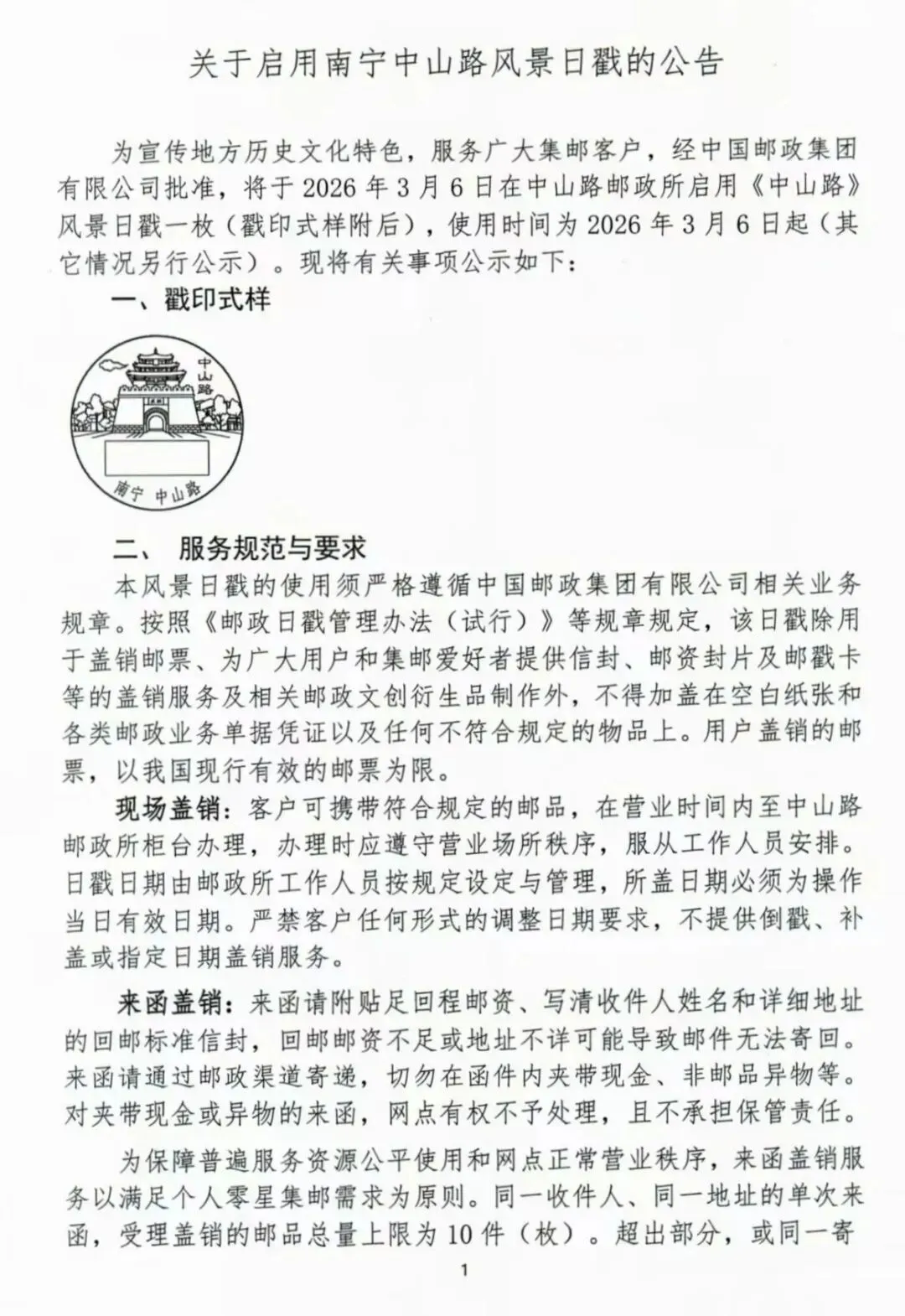 今天,看到了广西南宁邮政2026年3月1日发布的《关于启用南宁中山路风景日戳的公告》,对此,集邮者叫好,原因如下: