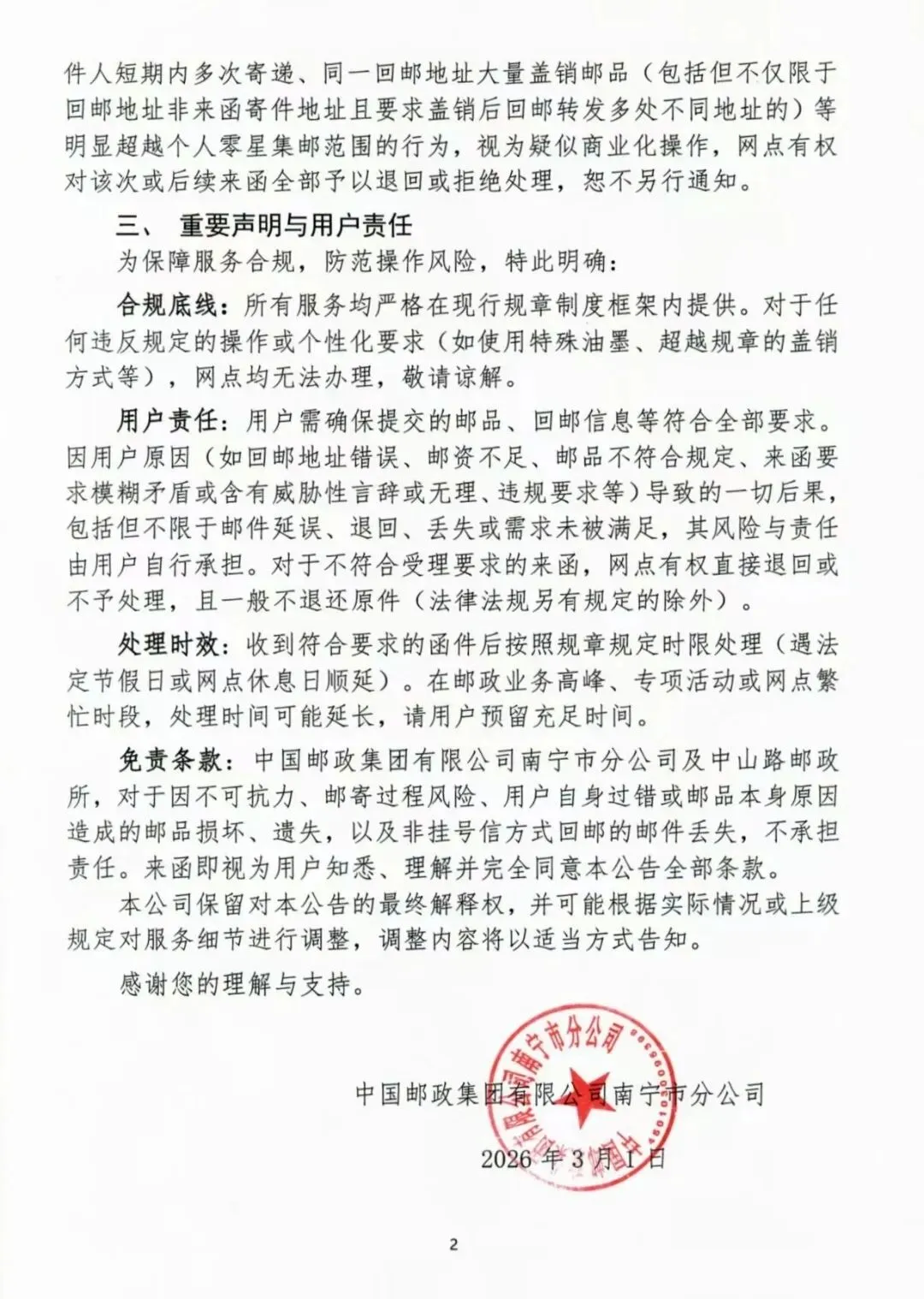 综上,南宁邮政的公告既体现了对集邮者合理需求的尊重,又展现了规范管理、防范风险的决心,是邮政服务与文旅融合的典范,值得肯定和推广。