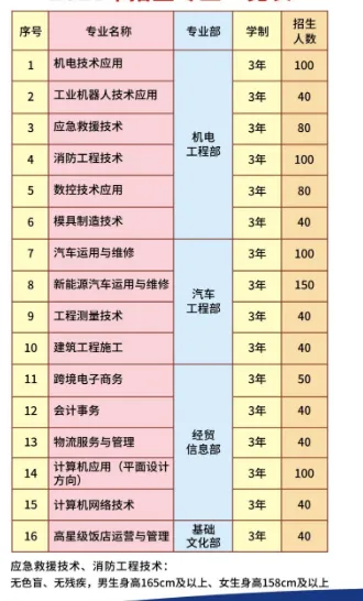 开设专业:开设有机电技术应用、工业机器人技术应用、应急救援技术、消防工程技术、数控技术应用、模具制造技术、汽车运用与维修、新能源汽车运用与维修、工程测量技术、建筑工程施工、跨境电子商务、会计事务、物流服务与管理、计算机应用(平面设计方向)、计算机网络技术、高星级饭店运营与管理等16个专业,覆盖资源环境与安全、土木建筑、装备制造、电子与信息、财经商贸、旅游及交通运输七大领域。广西第一工业学校招生电话:13768304047 宁老师 13207770372 梁老师
