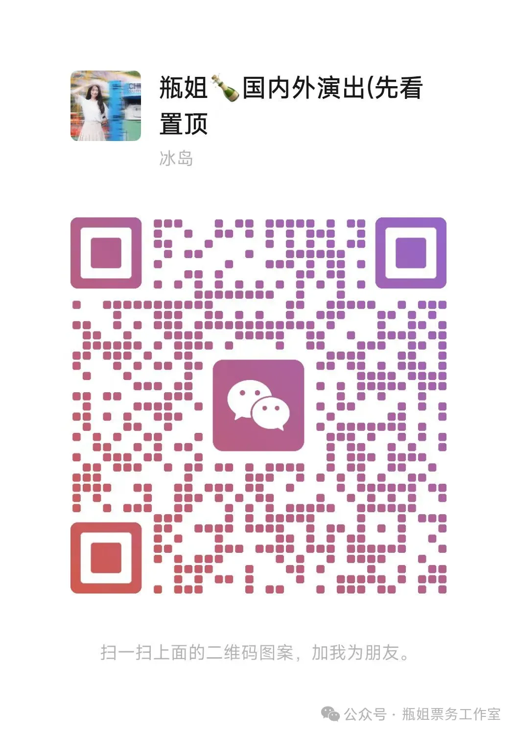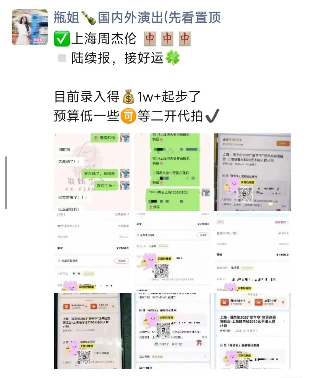预算足够的,又很想去现场,那么欢迎咨询瓶姐!专业靠谱耐心回复,多年经营靠谱售后,出票100%进场!保证您的本金没有任何损失!瓶姐一年的交易金额都非常大,公众号/朋友圈文案/视频都是自己创作编辑的,试想如果是骗子,还用得着这么用心吗?其实正常的代拍/录入没有很复杂,不管走不走平台,给不给营业执照,甚至低于市场价一两百,都有可能是骗子!因为事在人为,票务这件事就是看人靠不靠谱。瓶姐每天都会有老顾客推荐❤靠谱和口碑永远是最好的招牌!除了国内+海外演唱会资源,瓶姐这里也有话剧比赛脱口秀、livehouse音乐节、综艺录制(披荆斩棘的哥哥、浪姐、声生不息、你好星期六、火星情报局等)、电影首映礼路演、追剧团、剧组开机、明星品牌活动、见面会、跨年演出等资源~如果有需要其他演出的代拍/录入,以及想坐前排好位置,欢迎咨询瓶姐~