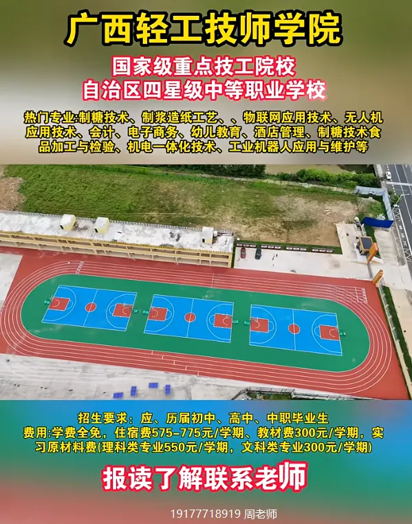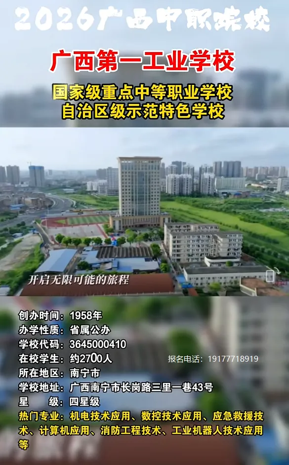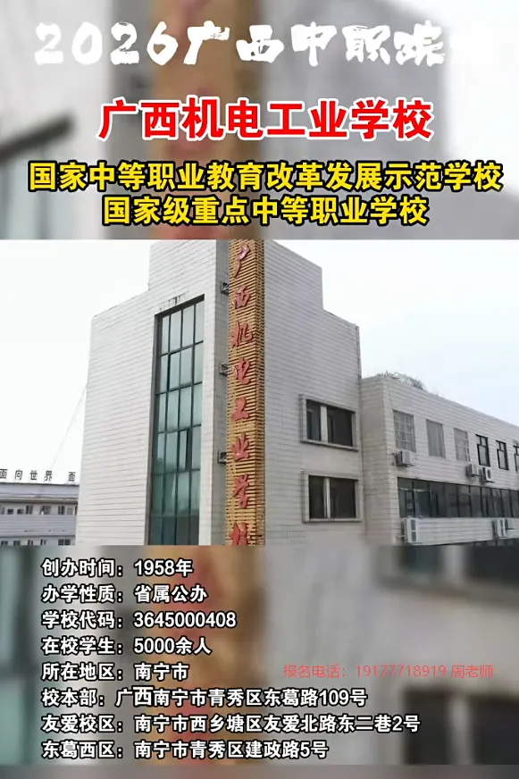 5、广西广播电视学校,公办三星级学校,设有升学班,位于南宁江南区亭洪路(地铁到校)。招生电话:19177718919 周老师(微信同步)6、广西工商学校,公办四星级学校,位于南宁市西乡塘区科德路(地铁到校)招生电话:19177718919 周老师(微信同步)7、广西轻工技师学院,国家公办院校,位于南宁市江南区(三个校区)招生电话:19177718919 周老师(微信同步)8、广西动力技工学校,公办学校, 位于南宁市武鸣区,与安职共用大学下校园,环境优美,武鸣生源首选。公办学校,学费全免,基本只是收学杂(住宿费和教材费+部分实习材料费)一学期不会超出1500元,擦亮眼睛懂得区分公办和民办学校哦!中考出成绩前不看分数,中考出成绩后从高到低录取,择优录取,录满截止,故每年的分数要求不一样,所以家长要提前给孩子预定名额。考不上高中的孩子可以添加下方老师微信或发送问题,老师将第一时间为你解答 广西公办中专报名时间报名时间:2026年1月—8月招生电话:191 7771 8919 / 189 0777 3301 周老师广西公办中专录取时间录取时间:中考成绩公布起至录满为止报名方法:请提前联系老师报名或到校现场报名可添加老师微信咨询报名:03招生名额:每个专业名额有限,招满为止,请尽早报名。05联系方式:联系电话:19177718919(微信同号)06广西区中职院校:南宁市第一职业技术学校、南宁市第四职业技术学校、南宁市第六职业技术学校、南宁市第三职业技术学校、南宁市卫生学校、广西机电工程学校、广西机电工业学校、广西第一工业学校、广西工商学校、广西广播电视学校、广西工贸职业技术学校、广西纺织工业学校、广西邮电技工学校、广西轻工技师学院、广西商贸技师学院、广西物资学校、广西动力技工学校等等(声明:以上内容贵在分享,版权归原作者及原出处所有,分享为公益,未用于营利,如涉及版权等问题,请及时与我们联系,我们会第一时间进行处理。)