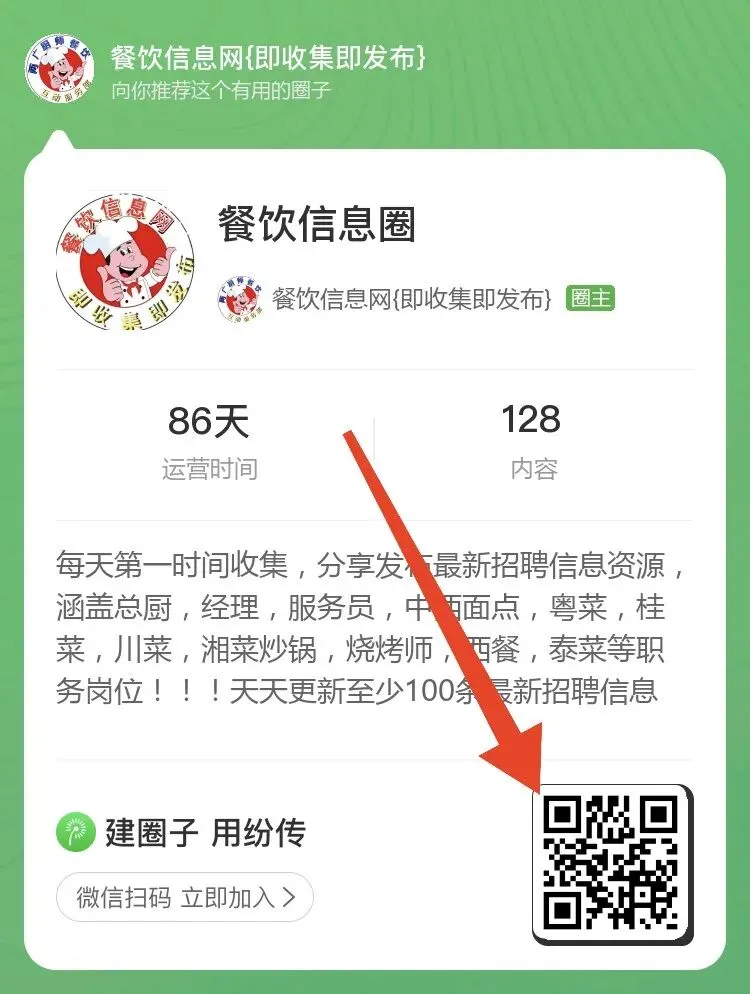因公众号每天只能更新一次,导致有很多招聘信息资源没能第一时间更新发布,所以特意创建了一个纷传餐饮招聘信息圈子,方便找工作的餐饮厨师同行,主要是发布广西区域,广东区域,日料寿司刺身和省内精选信息,公众号没有的,圈子里面都有,如果大家对于招聘信息资源需求比较多,可以选择点击下方小程序加入餐饮信息圈!每日至少提供100条以上最新招聘!!!目前定价是10元一个月,2个月18元,按天算一天才3毛钱,每天花2个多小时时间。本质也是等价交换,如果觉得值,并且需要更多资源,可以点击下方小程序加入一下吧!