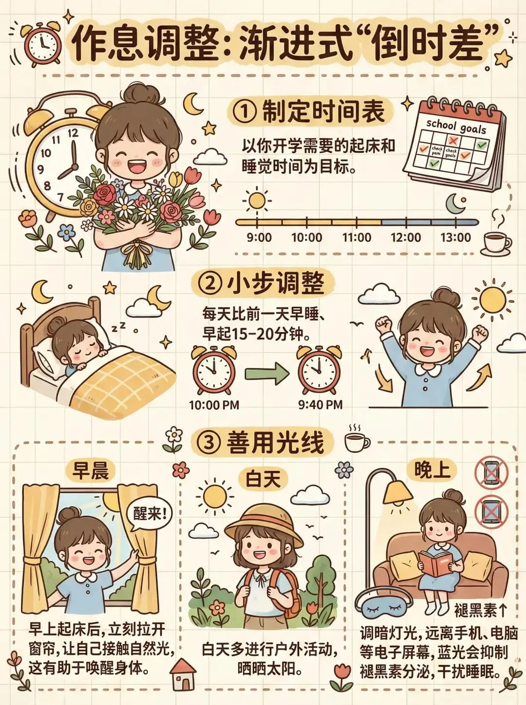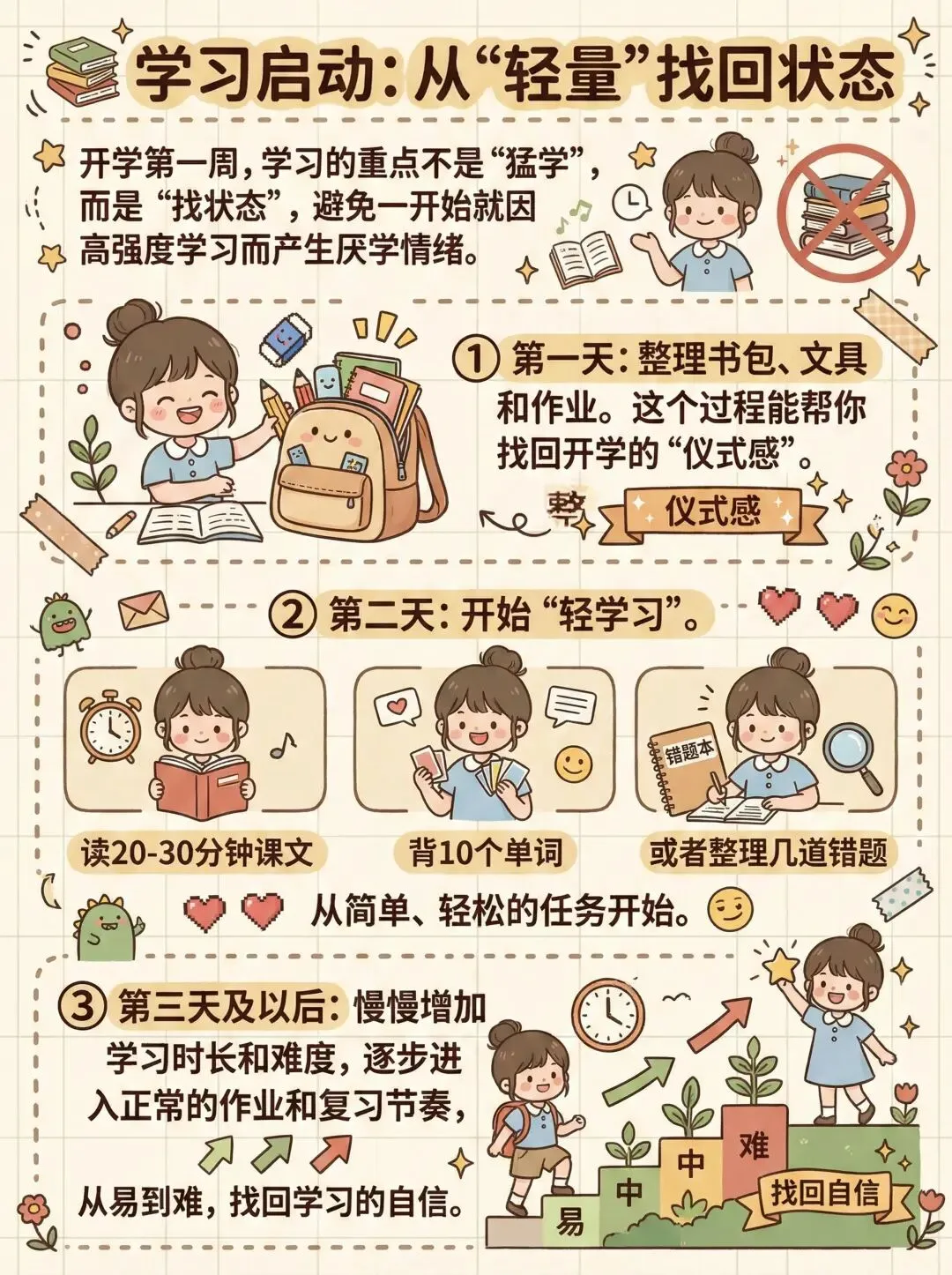 二、3步收心技巧,南宁家长可直接套用(周末1天见效)不用强迫孩子刷题、补课,掌握这3步,循序渐进调整,帮孩子轻松摆脱“开学综合征”,快速适应开学学习节奏,双职工家长也能轻松操作:第一步:调整作息,贴合南宁学校节奏,告别熬夜赖床作息紊乱是“开学综合征”的核心原因,周末重点帮孩子调整作息,贴合南宁各学校的上下学时间,不用一下子强制早起,循序渐进更易坚持:1. 晚上睡觉时间:小学孩子21:00前入睡,初中孩子21:30前入睡,睡前1小时关闭手机、平板等电子产品,可让孩子读绘本、听轻音乐,帮助入睡;2. 早上起床时间:比平时假期早起30分钟,逐渐调整到学校要求的起床时间(如小学7:00前,初中6:30前),起床后可简单运动5-10分钟,唤醒身体状态;3. 避免周末补觉:不要让孩子周末睡懒觉(建议不超过8:30起床),否则会加剧作息紊乱,周一更难起床。