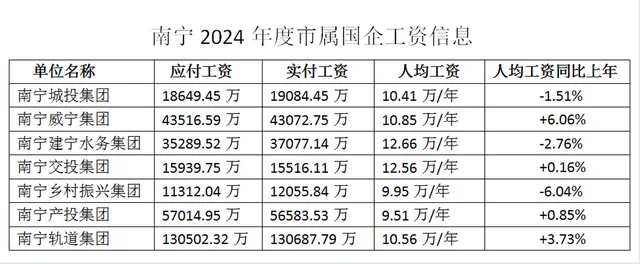 从发布的信息看,南宁建宁水务集团的人均工资最高,为12.66万元/年,相当于每月1.055万元。最低的是南宁产投集团,人均9.51万元/年。