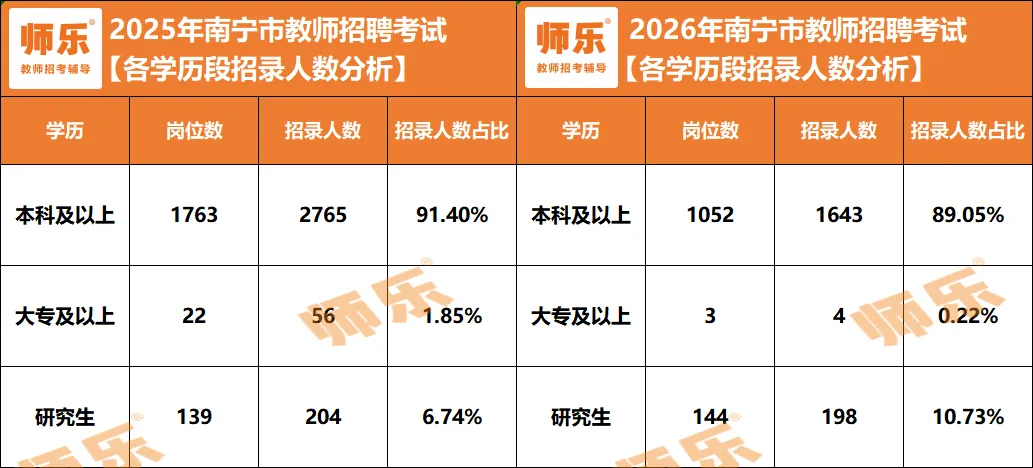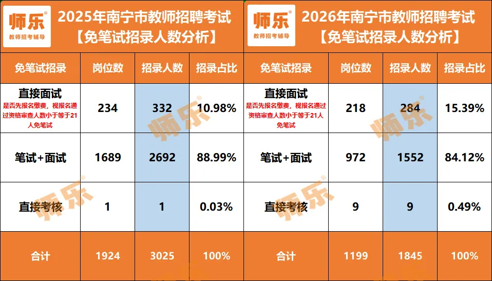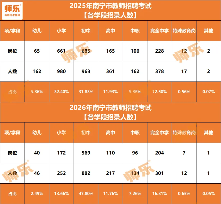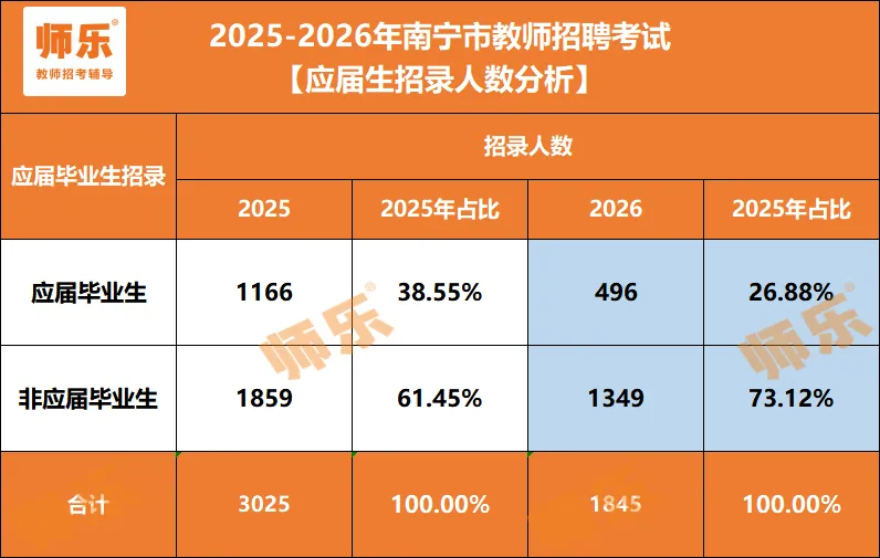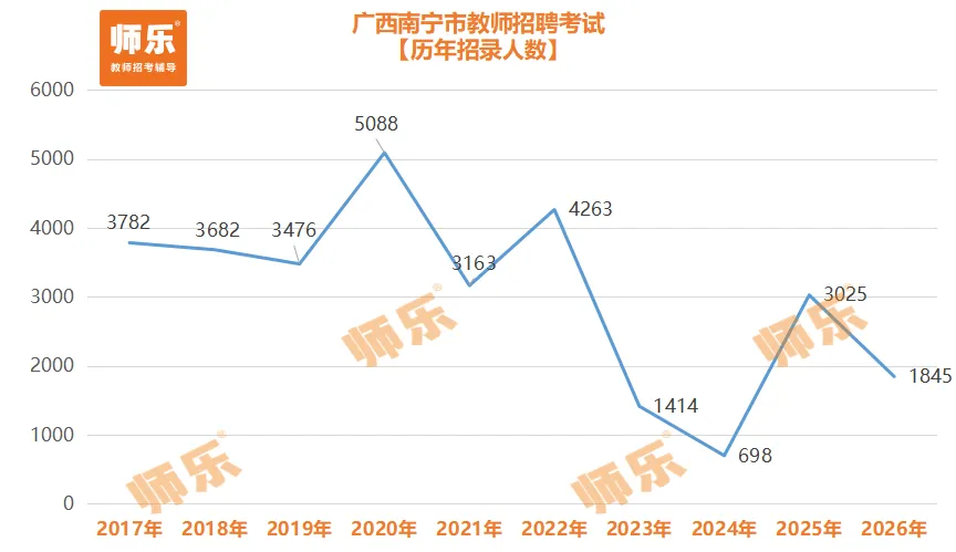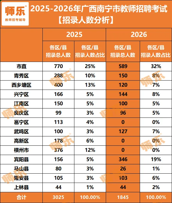 南宁市教师招聘从2025年起招聘形式回归全市统招,全年仅2次公开招聘,25年上半年招聘3025人,25年下半年招聘163人。2026年教师招聘人数相比去年同期减少39%!仅招聘1845人。南宁教师招聘考试机会少,错过等一年,明年或持续缩编,大家要抓紧上岸!