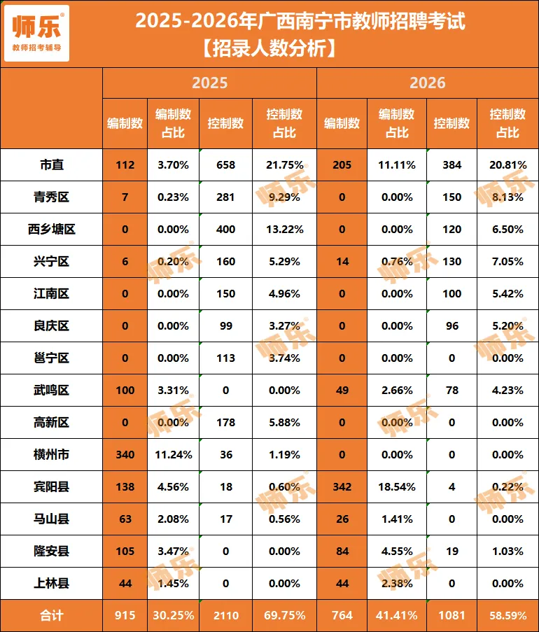 南宁市26年教师统招主要集中在市直、宾阳县、青秀区、兴宁区。市直属学校招聘589人,占招录总人数32%。宾阳县招346人,占招录总人数19%。青秀区招150人,兴宁区招144人,各占招录总人数8%。市直对教师的需求数量比较稳定,值得注意的是,邕宁区、高新区、横州市今年无岗可报!要考这几个区县的宝子们天塌了!