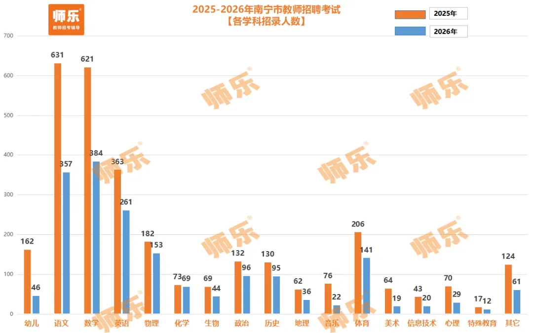 2026年招录人数最多的学科是数学、语文、英语三个学科,数学学科招录人数384人,语文学科招录人数357人,英语招录人数261人。值得一提的是,2026年南宁全市体育岗招141人,还有物理、历史岗位招聘人数也较多。