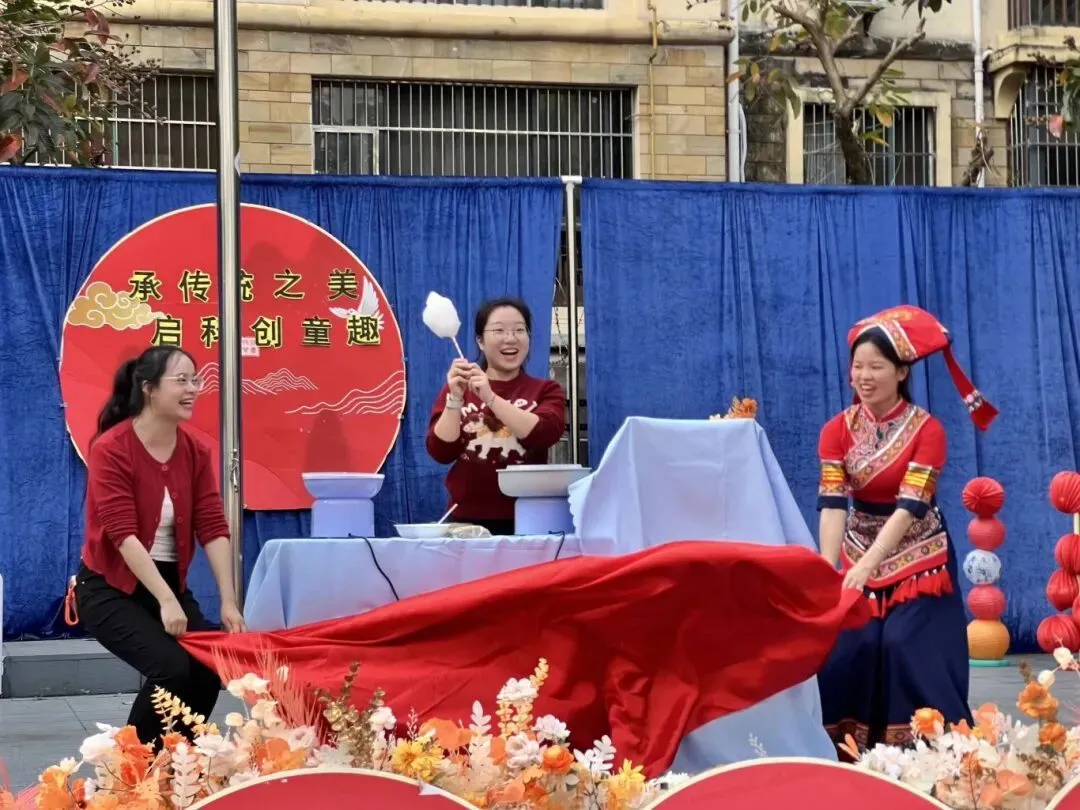大班幼儿带来灯笼舞《爆竹声中一岁除》,以灵动舞姿拉开活动序幕。活动展示毛笔书写、剪纸、织布等传统文化场景,让幼儿近距离感受非遗文化魅力。科技互动环节“神奇棉花糖”深受孩子们喜爱,教师现场演示并邀请幼儿动手实践,在趣味体验中激发探索精神。